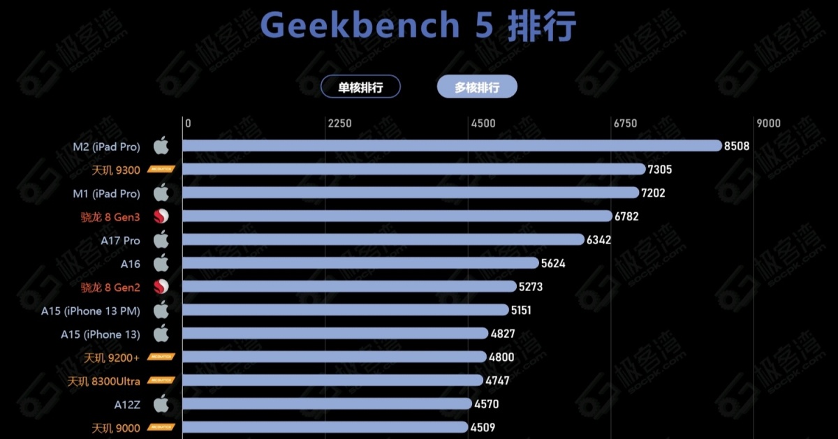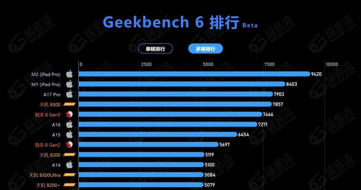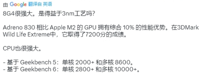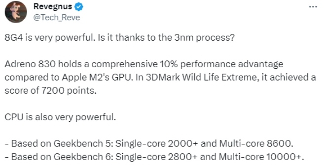 ◆ 骁龙 8 Gen 4(Adreno 830),早期版本,于该项目中,约7200 分,要比苹果 M2 高出 10%。