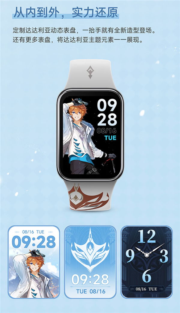 手环主体主要是定制了特别款表带,采用浅灰主色更百搭,同时还内置了达达利亚动态表盘,每次抬手都是全新的造型,此外还有多款《原神》和达达利亚元素表盘可选。
