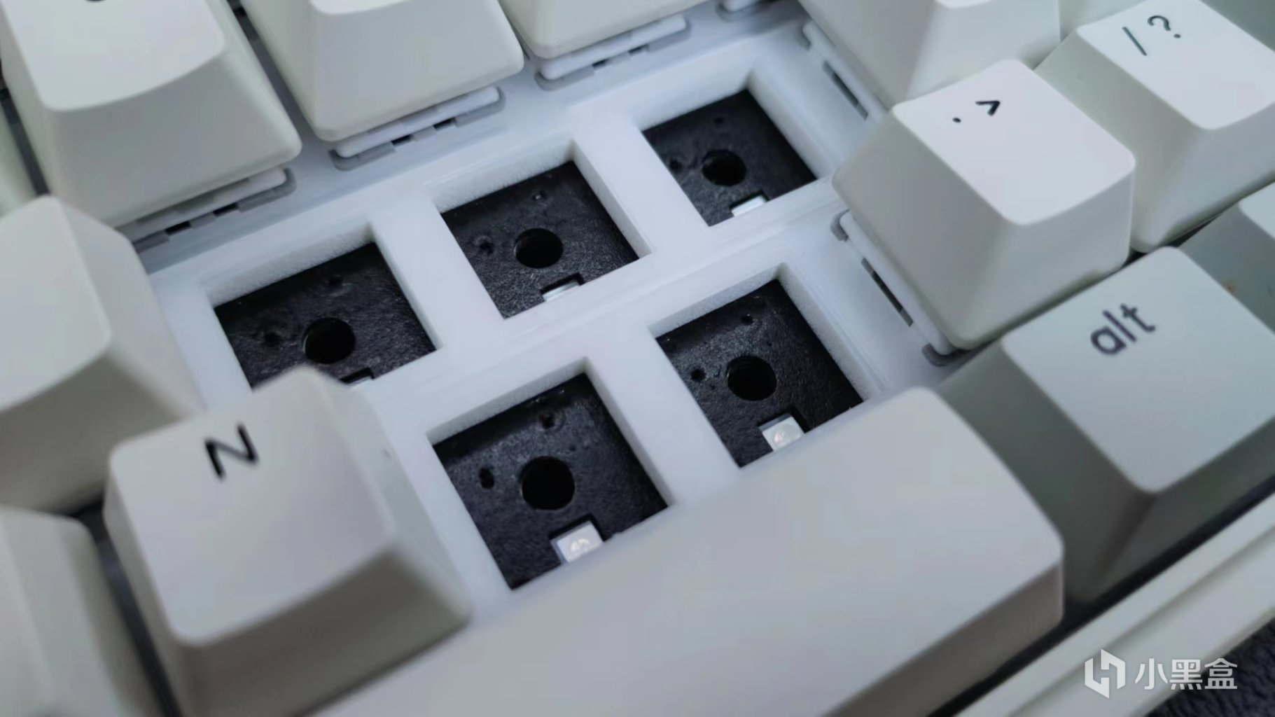 键盘的内部结构呢还得到了升级,在传统的GASKET结构的基础上使大尾巴依靠超临界发泡回弹材料悬浮在键盘内部,并提供弹性缓冲行程,进一步减少内部空腔音以及杂音,可以让键盘的敲击声更加纯粹清晰。而键盘的内部填充呢为PET棉+8倍发泡IXPE轴下垫+底垫泡棉+夹层泡棉,填充方面也还算不错,