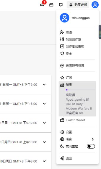 Twitch官网,登录后点击右上角头像,找到“掉宝”。