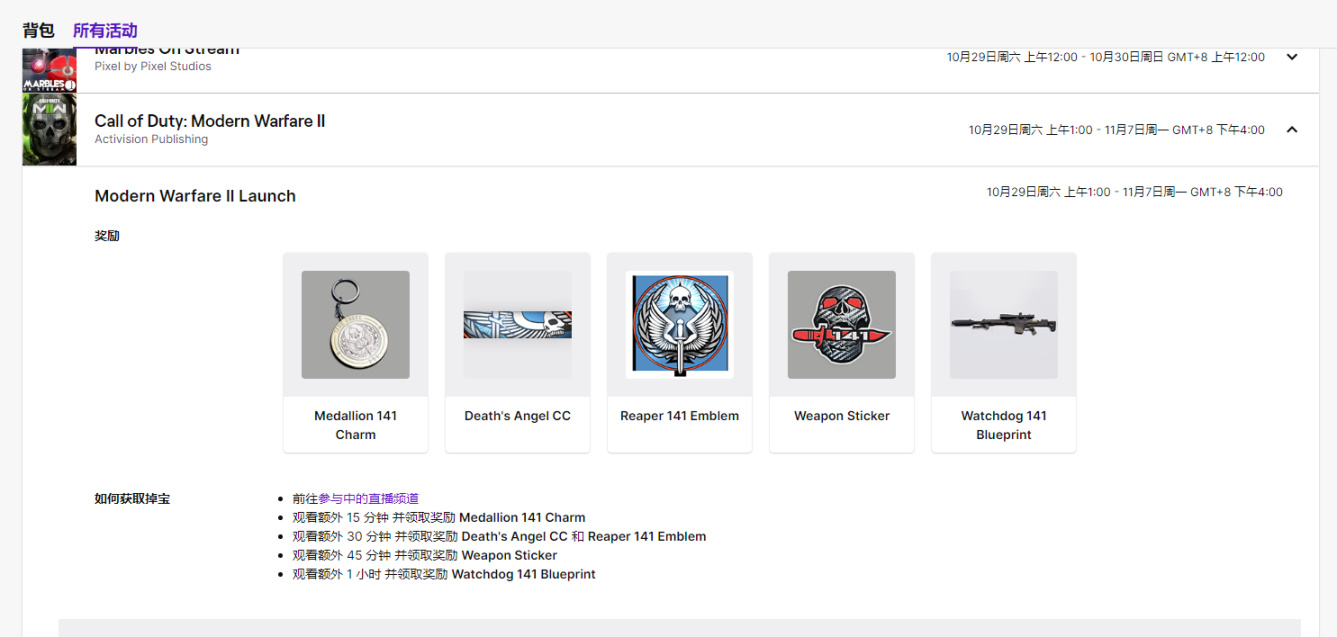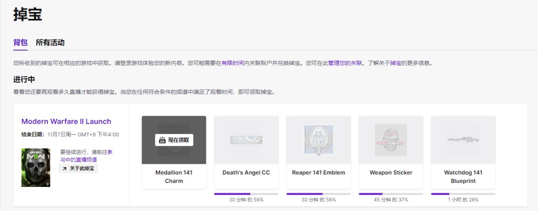 随着《使命召唤:现代战争Ⅱ》的正式发布,Twitch也开启了观看直播掉宝奖励,可以获得武器蓝图、纹章、名片和武器贴纸。时间为即日起至11月7日。