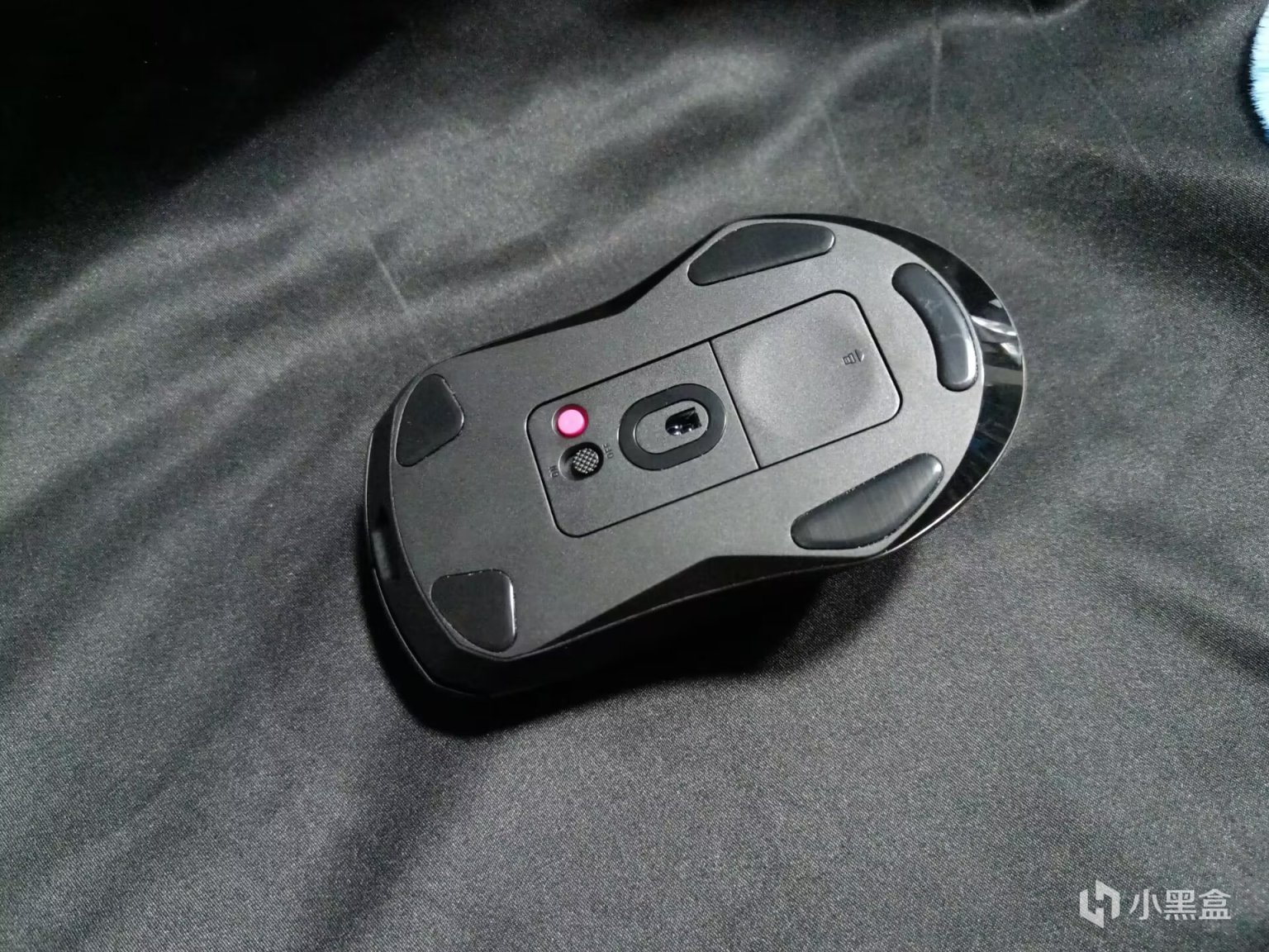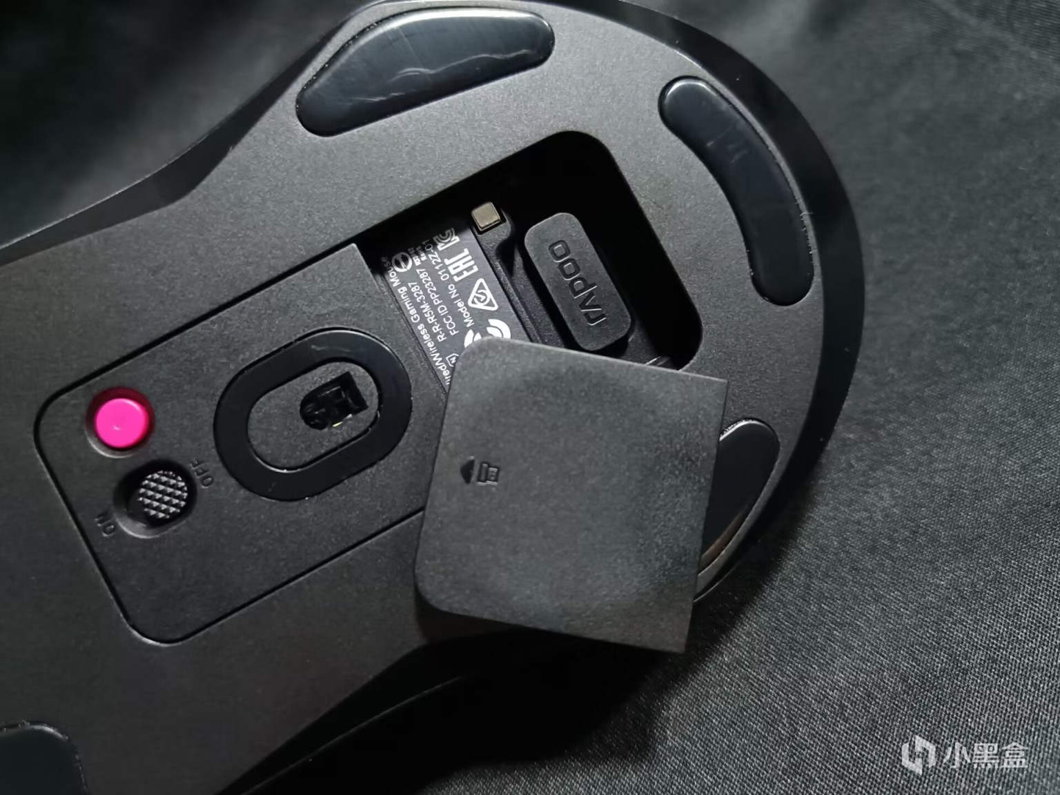 鼠標底部,腳墊是PTFE特氟龍材質,傳感器是放置在了中心位置,上面是電源鍵,電源鍵的右側是一個DIY按鍵,大家可以在驅動中設置其對應的功能,雷柏提供的預設功能還是很多的,“顯示桌面”這個功能深得我心,也可以自行設置對應的組合鍵,摸魚神器好吧。