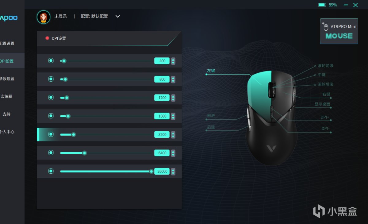 大家比較關注的傳感器方面,VT9PROMini採用的是雷柏與原相合作定製的3398傳感器,開放了1.0-2.0mm,11檔靜默高度(LOD)可供調整,以及提供50-26000DPI靈敏度,650IPS追蹤速度,50G加速度,DPI方面預設七檔,也都是可以在驅動中自由調節的,調節到自己常用的DPI可以快速適應新鼠標。
