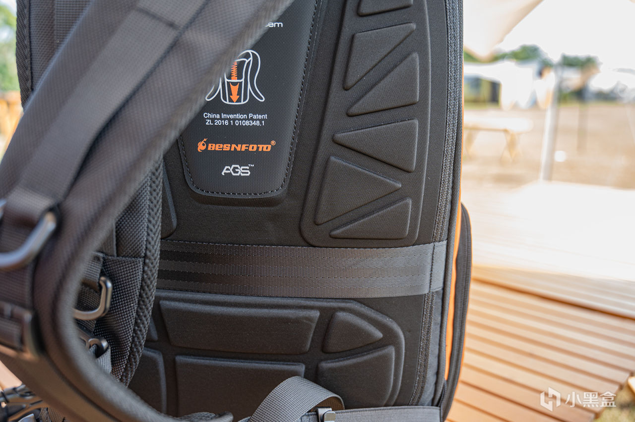 背板有点龟甲一样的缓冲,挺厚的,能减震缓冲。一开始担心会不透气,但试过连续背上两个小时倒是没啥压力。