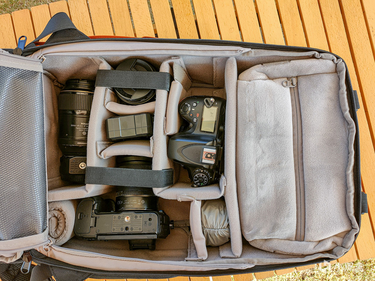 但是预留的空间太大了,哪怕手动改隔层还有不少冗余的空间。为此我还刻意把备用的魔术贴、防水罩都塞在侧边了。估计是为了放富士中画幅级别的大机器的吧。只怪我的低端微单太苗条,瘦成一度闪电。