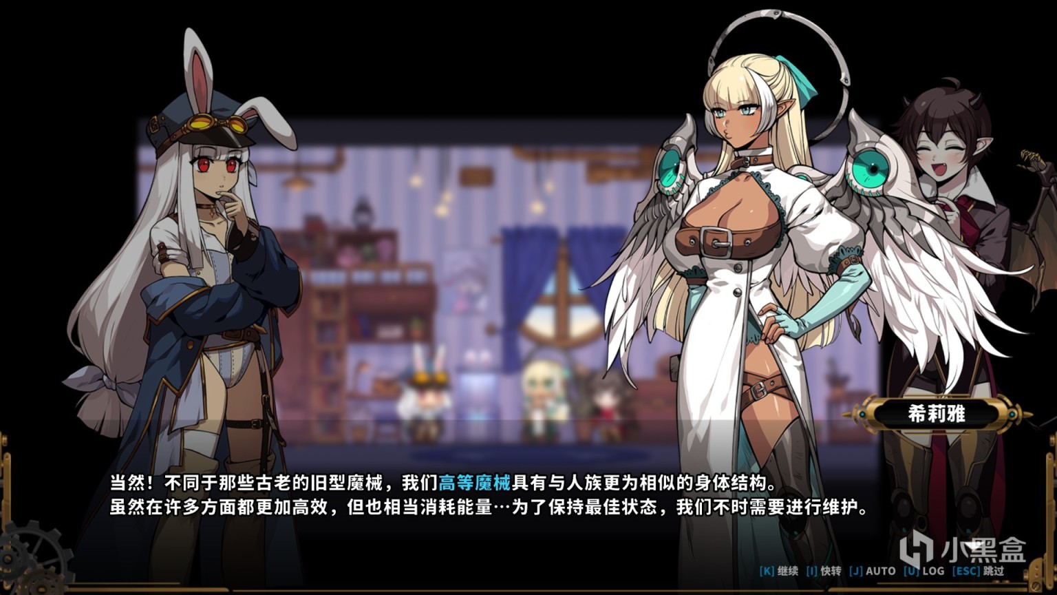 這片場景下本作的故事講述跟前作相同,採用adv式人物對話,輔以少量像素小人演出和cg插圖。此外,全cv是重點,雖然提高了遊戲的成本,但增幅了沉浸感和情緒渲染,是同類遊戲裏難出其二的體驗。不同於前作的是,前作的劇情全是廢萌,沒有什麼信息量,而本作則有着更詳盡的世界觀,獸耳組、魔械等設定契合視覺表現、填充了廣大的世界。