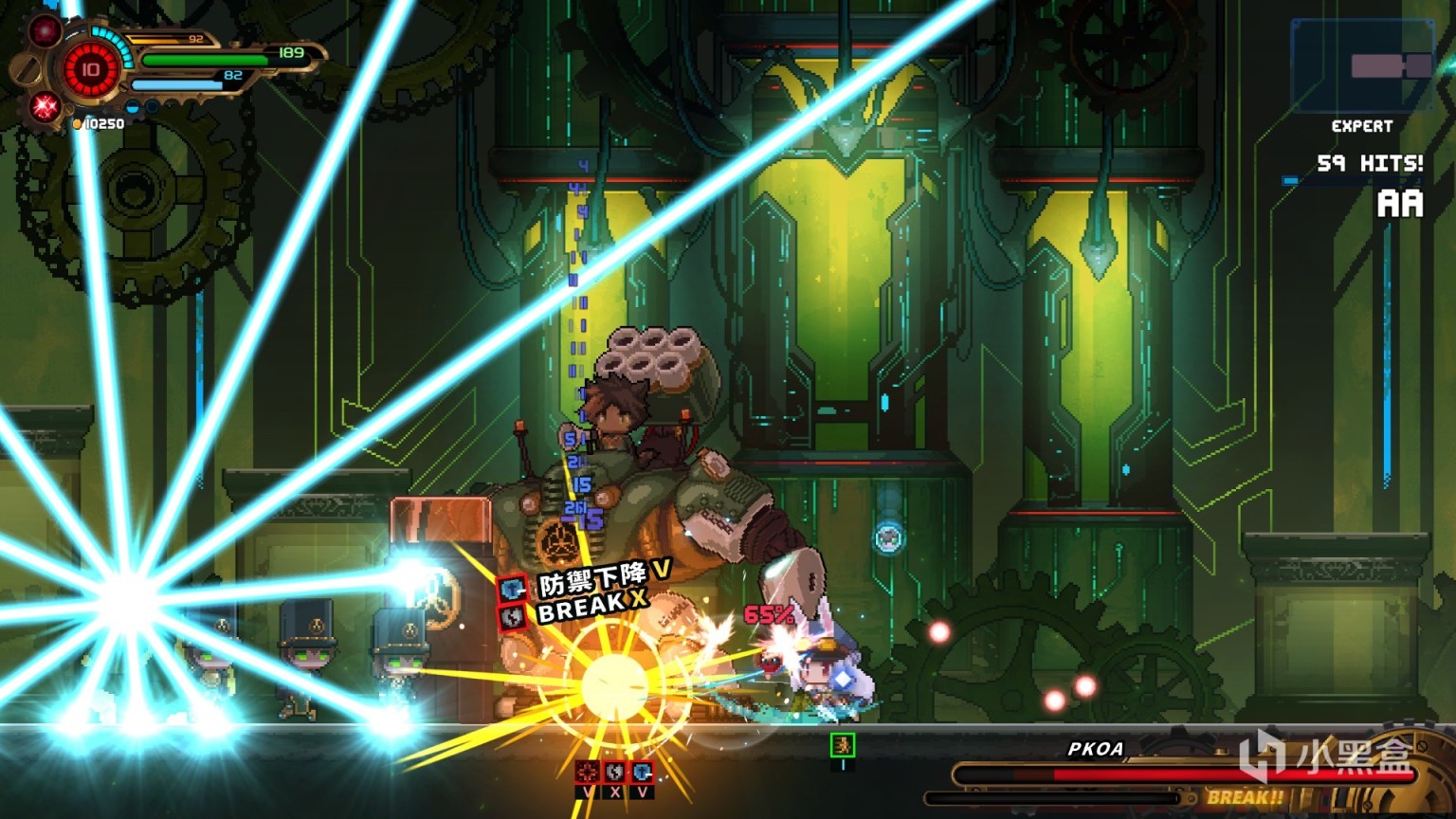 動作系統是本作最大的提升,幀率增高使得輸入延遲減少,操作更加順滑,角色像素模型動畫的細緻則帶來了流暢華麗的動作。隨着流程進行,玩家會逐漸解鎖多樣的攻擊方式,高傷的連斬與高連擊數的刺擊各有側重,蓄力扳手砸下時的特寫與震響魄力十足,甚至有輕輕需要搓招的連擊可以打出,新的動作機制如後跳閃避又提升行動力,讓本作的動作表現兼具速度感與爽快感。