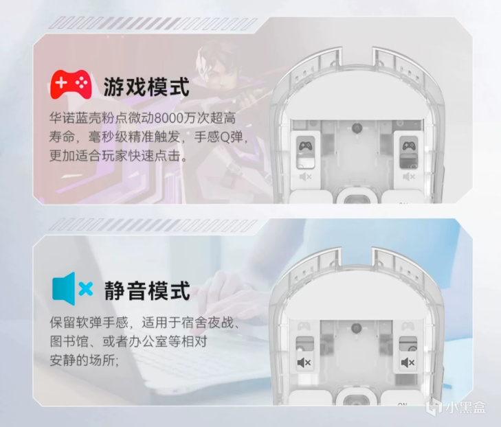 鼠标的包装方面相较于原版有一些小改变,但其中改变最大的无疑还是中间的鼠标实拍图,由原先的实色版本换成了这次的半透版本,单美中不足的点在于不是和具体颜色一样的实拍图,而是全部用的透明白版本。