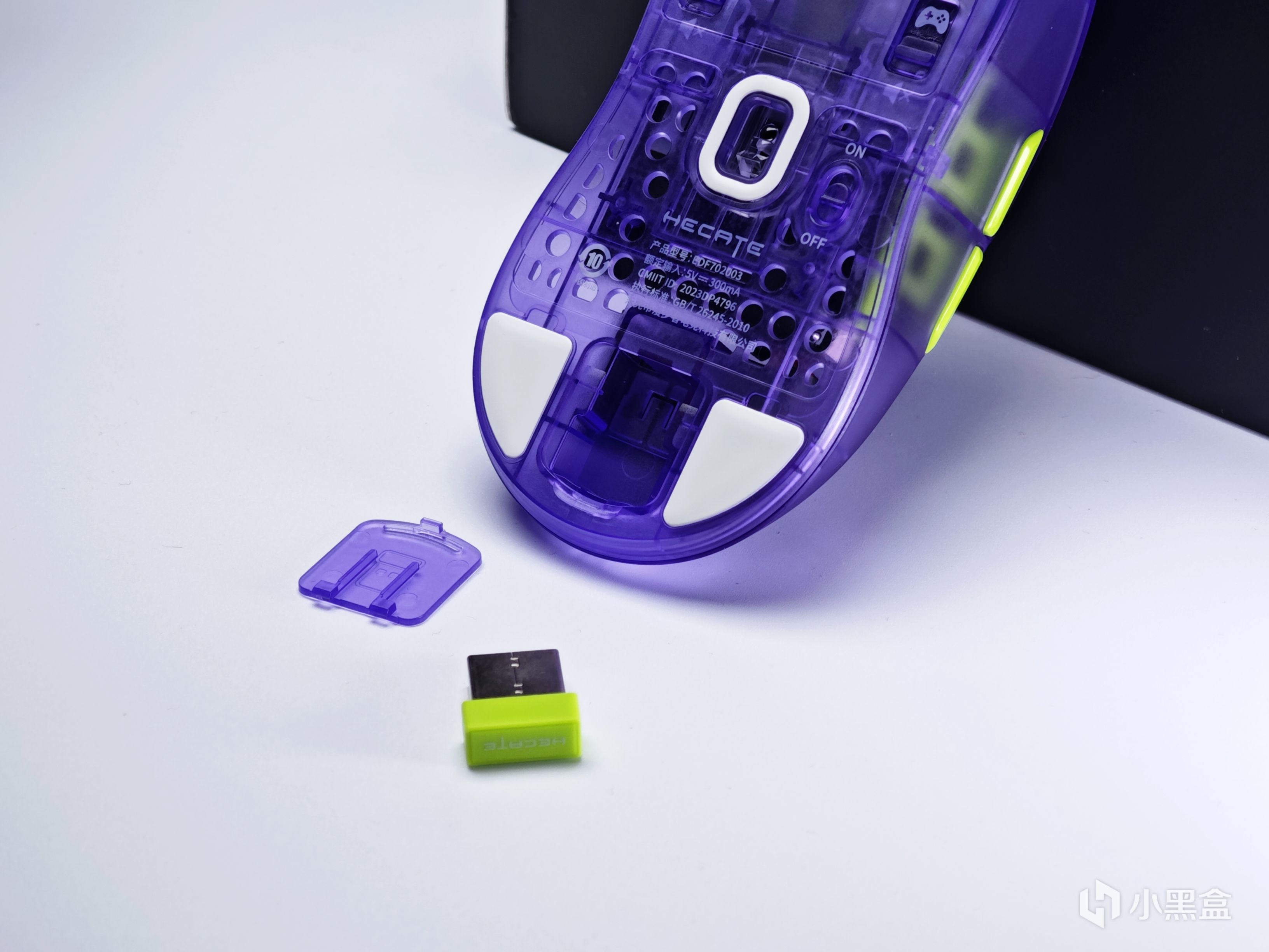 下方可以看到两个脚贴之间好像夹着什么?仔细一看是接收器收纳仓,没错,漫步者在鼠标内部加了一个接收器的收纳仓,可以防止日常使用中一不小心找不到接收器了,同时还贴心的加了一个盖子防止丢失,不过美中不足的就是没做磁吸了,可能是出于整体的重量考虑。