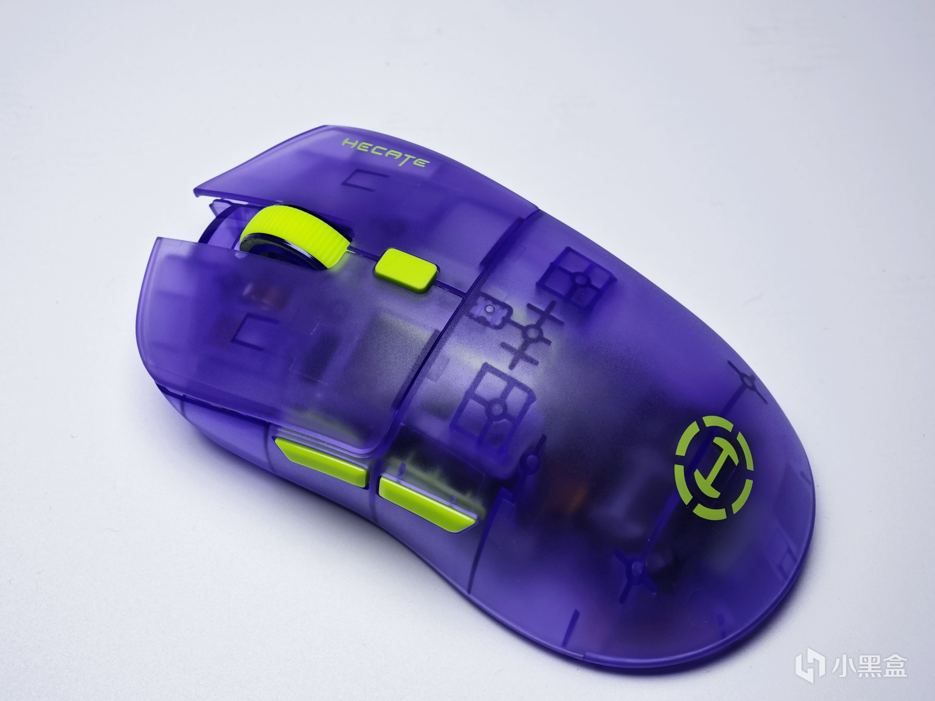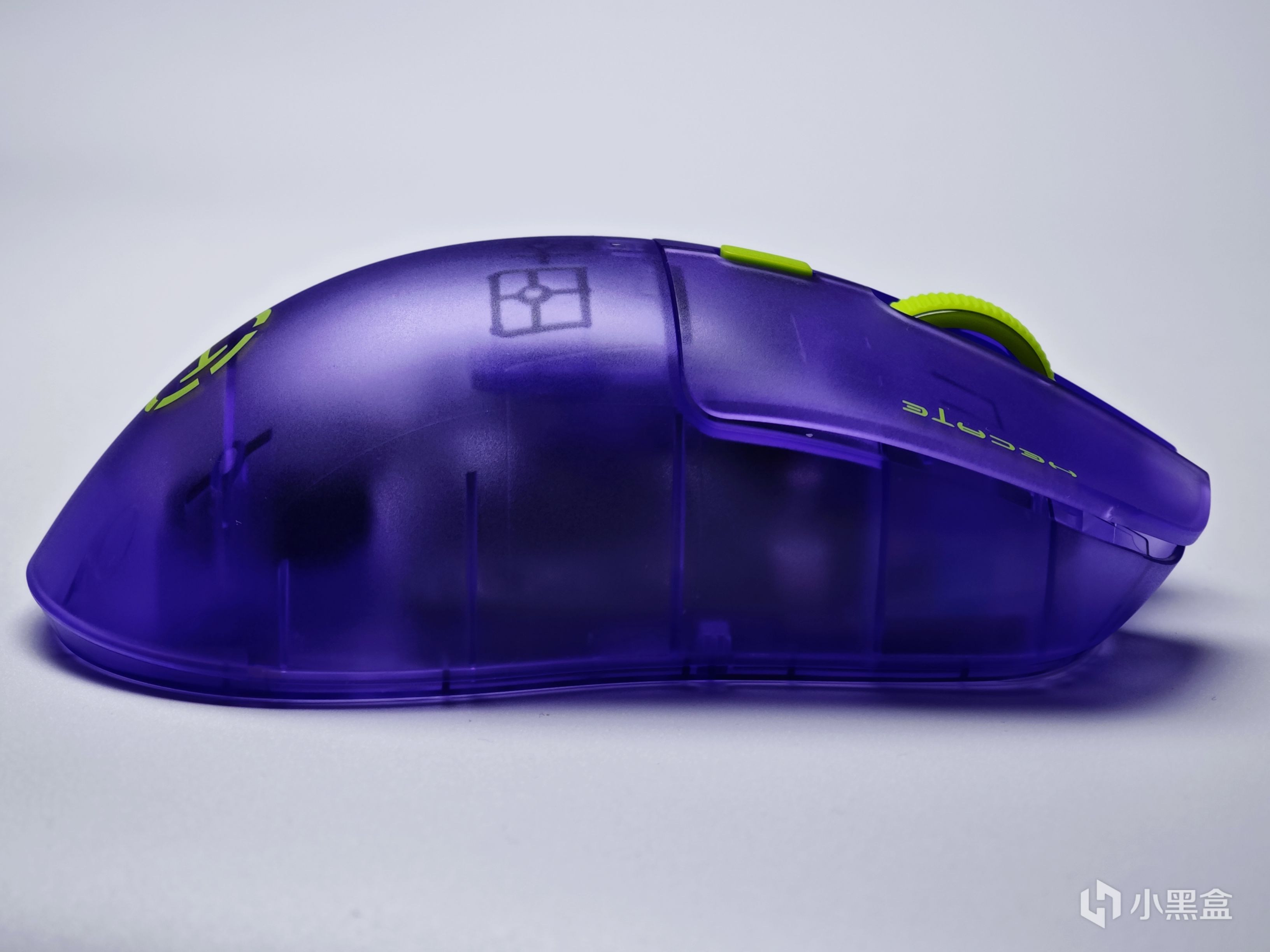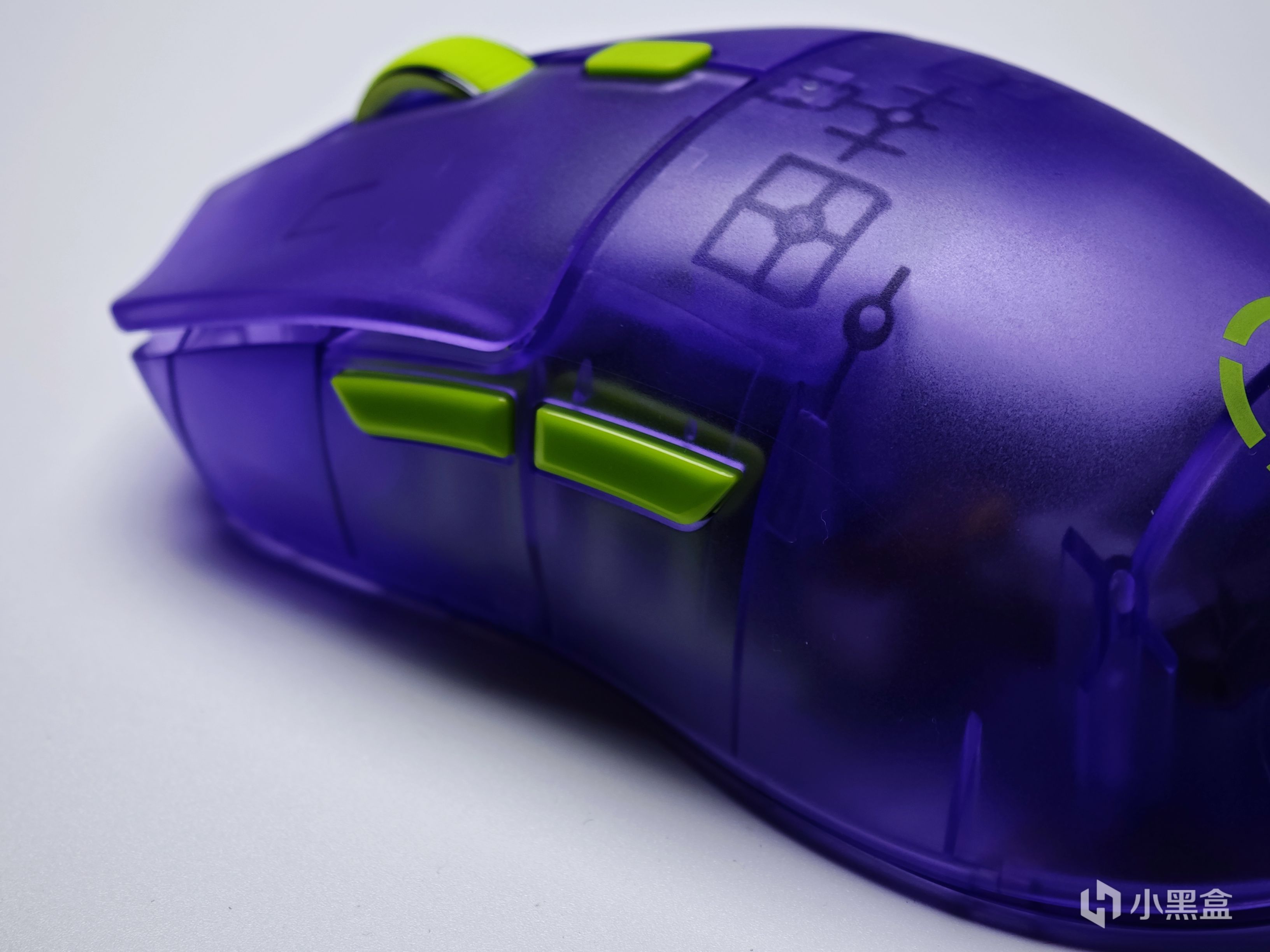 滚轮以及后侧的DPI切换按键都做成了绿色,和鼠标整体采用的半透紫色形成了拼色搭配,虽然官方宣称这款配色为透明紫,不过我个人感觉这款配色更像EVA中的初号机。