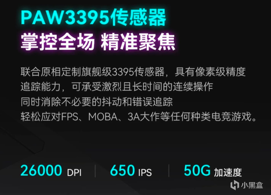 整体的性能想必是不用我再说的,搭载了目前顶级性能之一的原相PAW3395传感器,最高可达26000DPI,同时还有650IPS和50G的加速度,整体可以说再用五年都没问题,性能对于目前的游戏来说都是绰绰有余的。同时主控方面采用的是维盛的09m37a,提供了有线/2.4G/蓝牙三种连接方式,即使是给没有USB接口的轻薄本使用,也毫无压力。