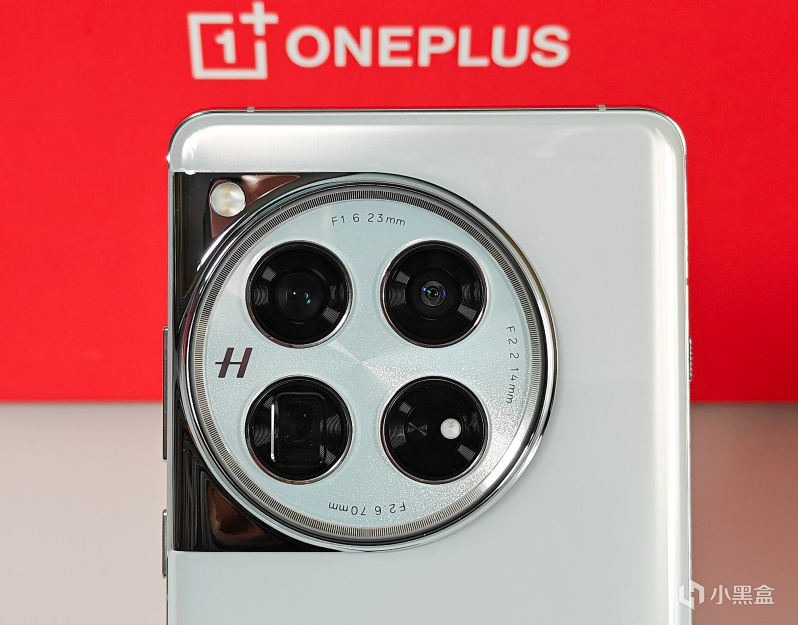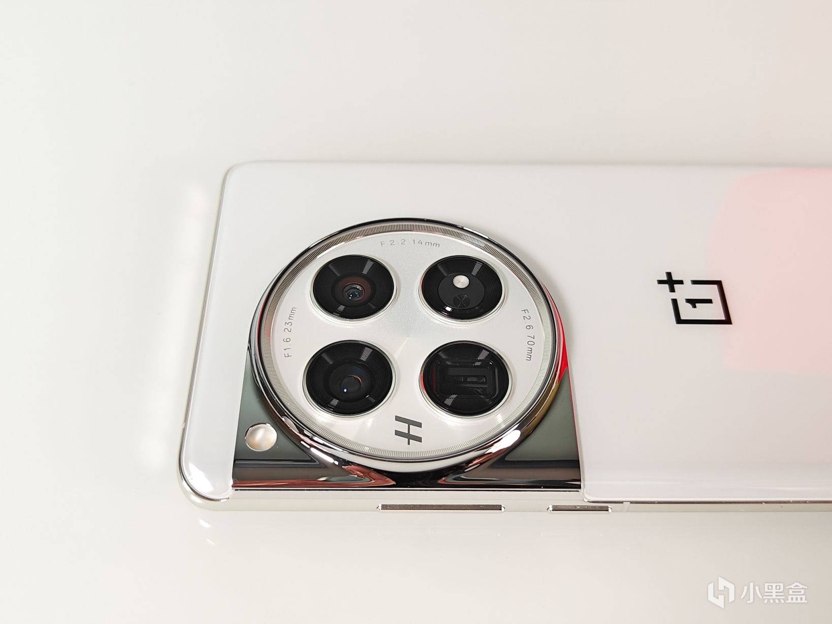 四個同等大小的鏡頭圈規整排列,每個鏡頭圈都有CD紋點綴, 其中三個是攝像頭,另外一個則是兩顆傳感器,猜測一個是環境亮度傳感器,另外一個是宣傳的13通道多光譜傳感器,用於更高精度的顏色識別。環形字符,左側的是H,哈蘇的LOGO,其餘則是以及三顆攝像頭的重點參數,F1.6 23mm的主攝鏡頭、F22 14mm的超廣角,以及F26 70mm的潛望式長焦。而之前的閃光燈,則是移到了這個星盤的外側左上角。