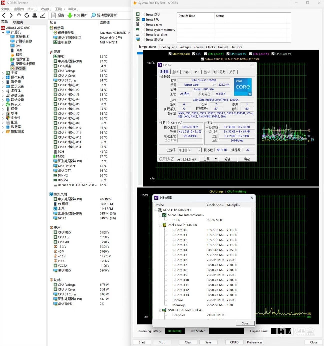 ▼日常待机情况,室温在20℃左右,处理器的待机温度在37℃左右,供电37℃,显卡核心32℃,固态42℃。