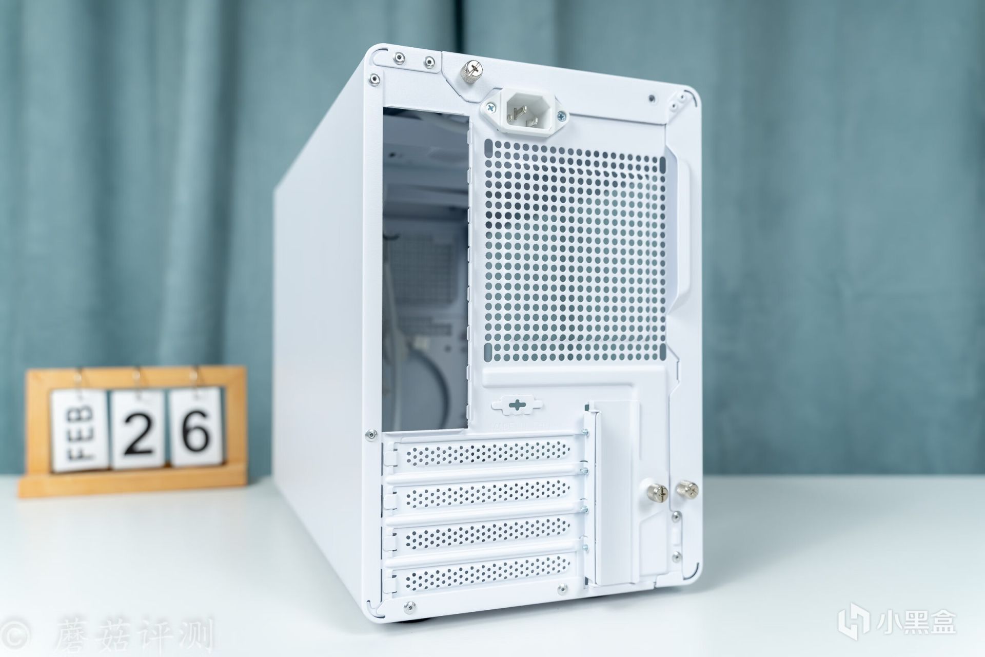 ▼机箱尾部,紧凑的mATX机箱配置,顶部有一个AC电源插孔,底部有四条PCIe金属挡板。