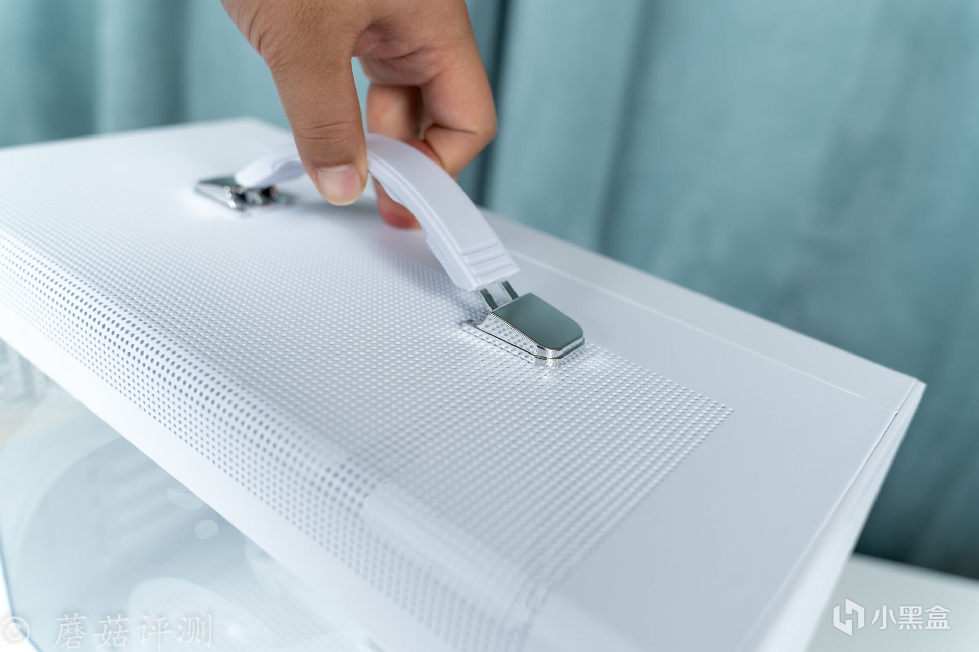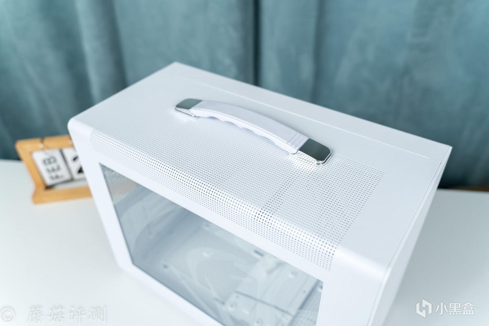 ▼机箱顶部,有大面积的金属冲孔网,另外标配了一个提手。