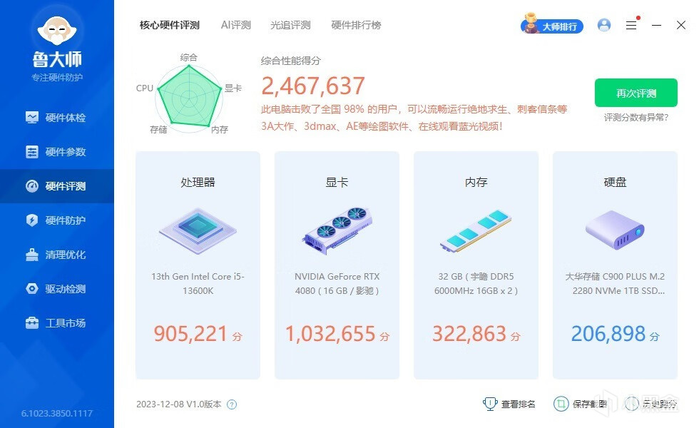 ▼整机配置一览,处理器是13600K,显卡是影驰的RTX4080星耀OC。