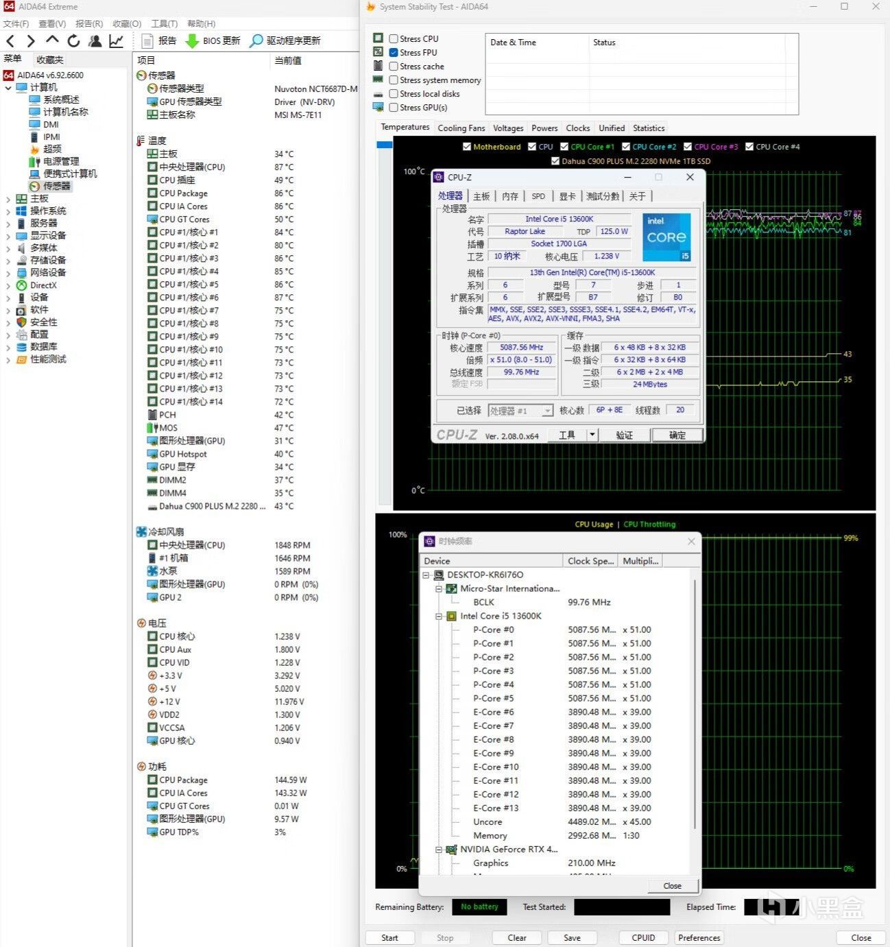 ▼跑个CPU-Z的压力测试,处理器功耗在145W左右,大核心睿频5.1GHz,小核心睿频3.9GHz,温度在87℃左右波动。供电47℃,显卡核心31℃,固态43℃。