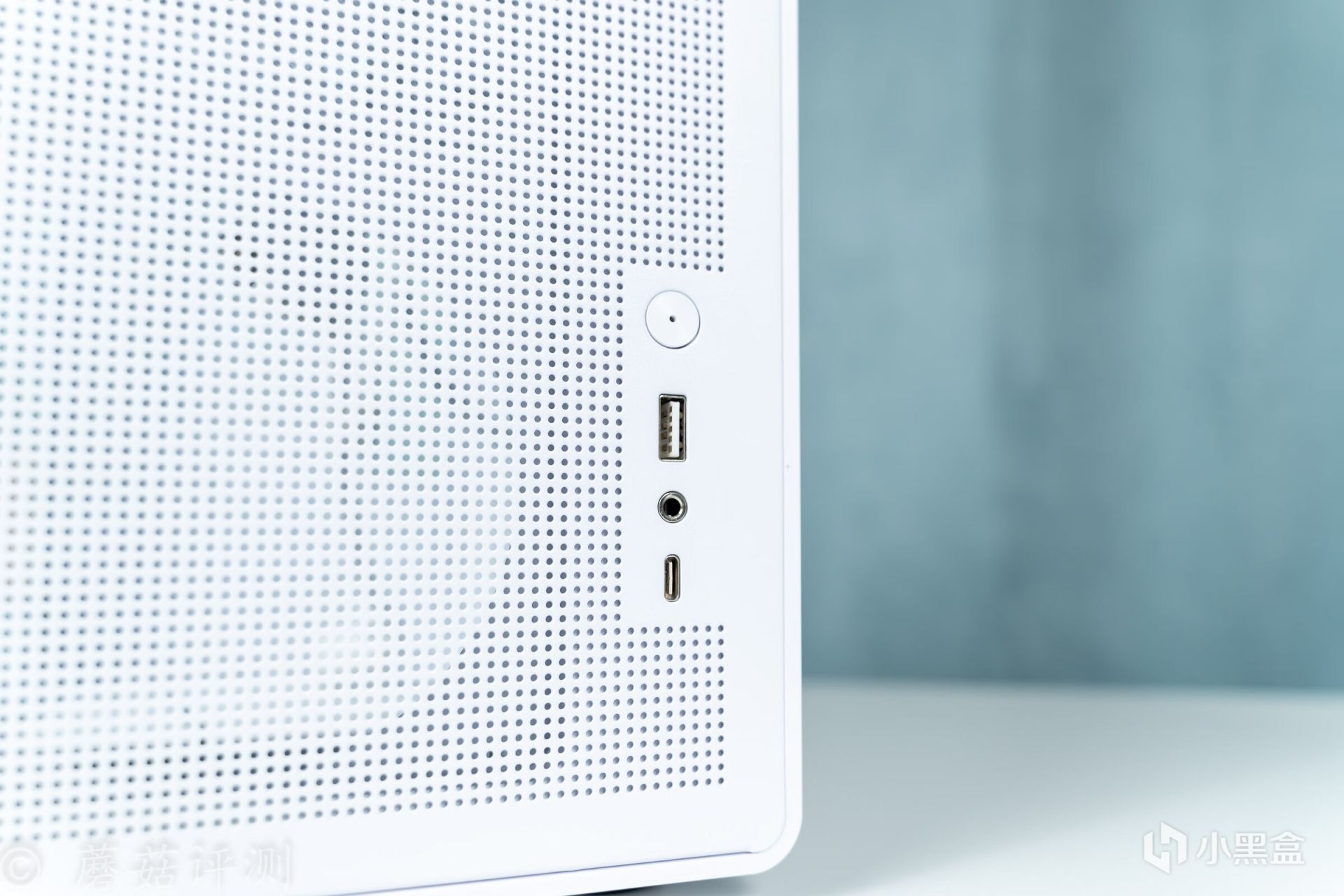 ▼机箱的右下角是IO面板,顶部是开机键,底部有一个USB 3.0 Type-A接口、一个3.5mm音频插孔、一个Type-C接口。