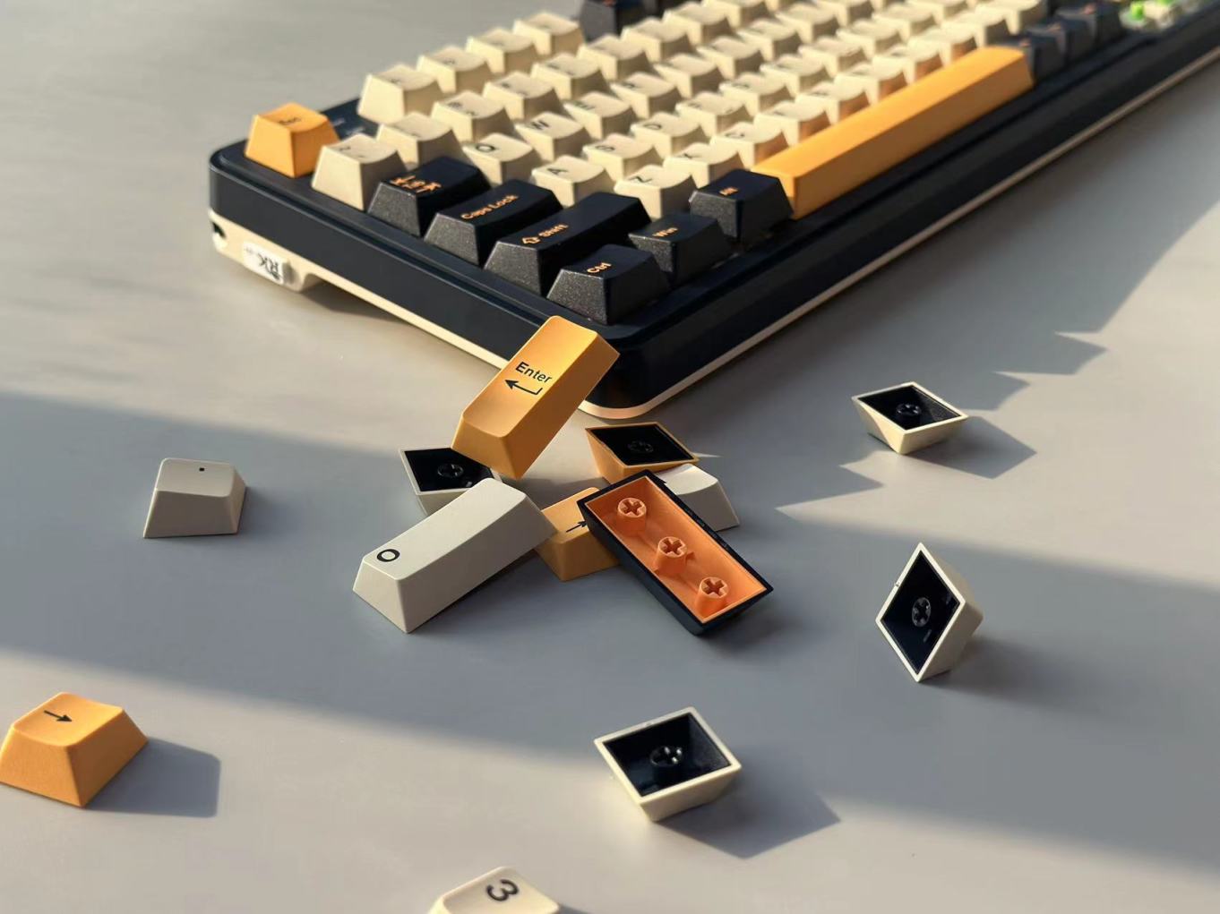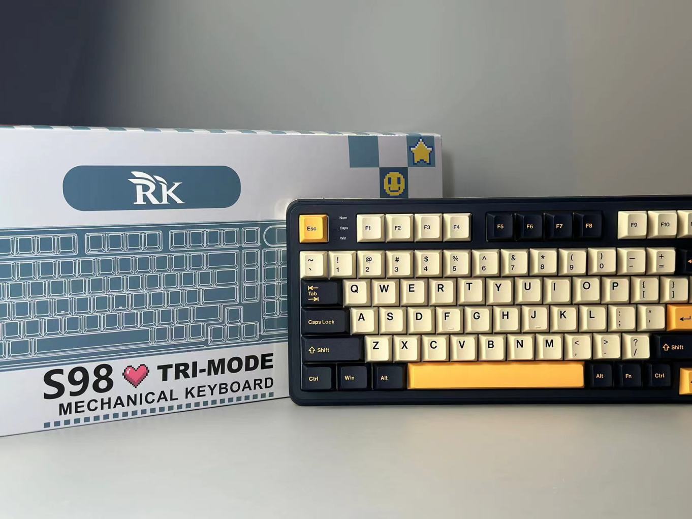 S98的键帽采用原厂高度,二色工艺PBT材质。整个键帽上手比较丝滑,且明显可以看出键帽内加有颗粒进行寿命延长。而配色方面则是采用黑白黄的三拼色,看着也是非常有高级感的。