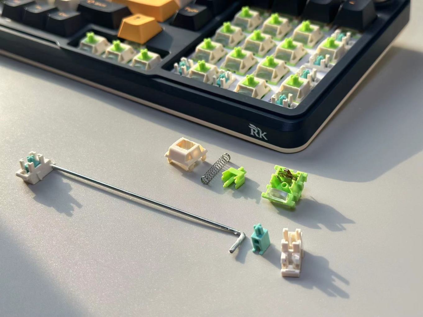 我手上的是碧螺轴体,轴体外壳为POM材质,YL轴心且带有导光柱。整个轴体的在轴心导轨,小爪,以及弹簧限位柱都是进行了润滑。轴体触发轻,顺滑程度也很不错。