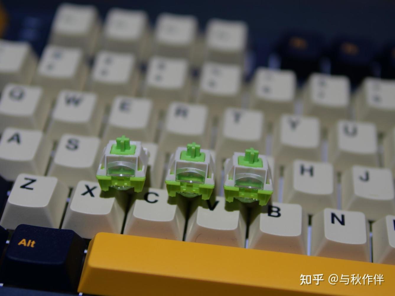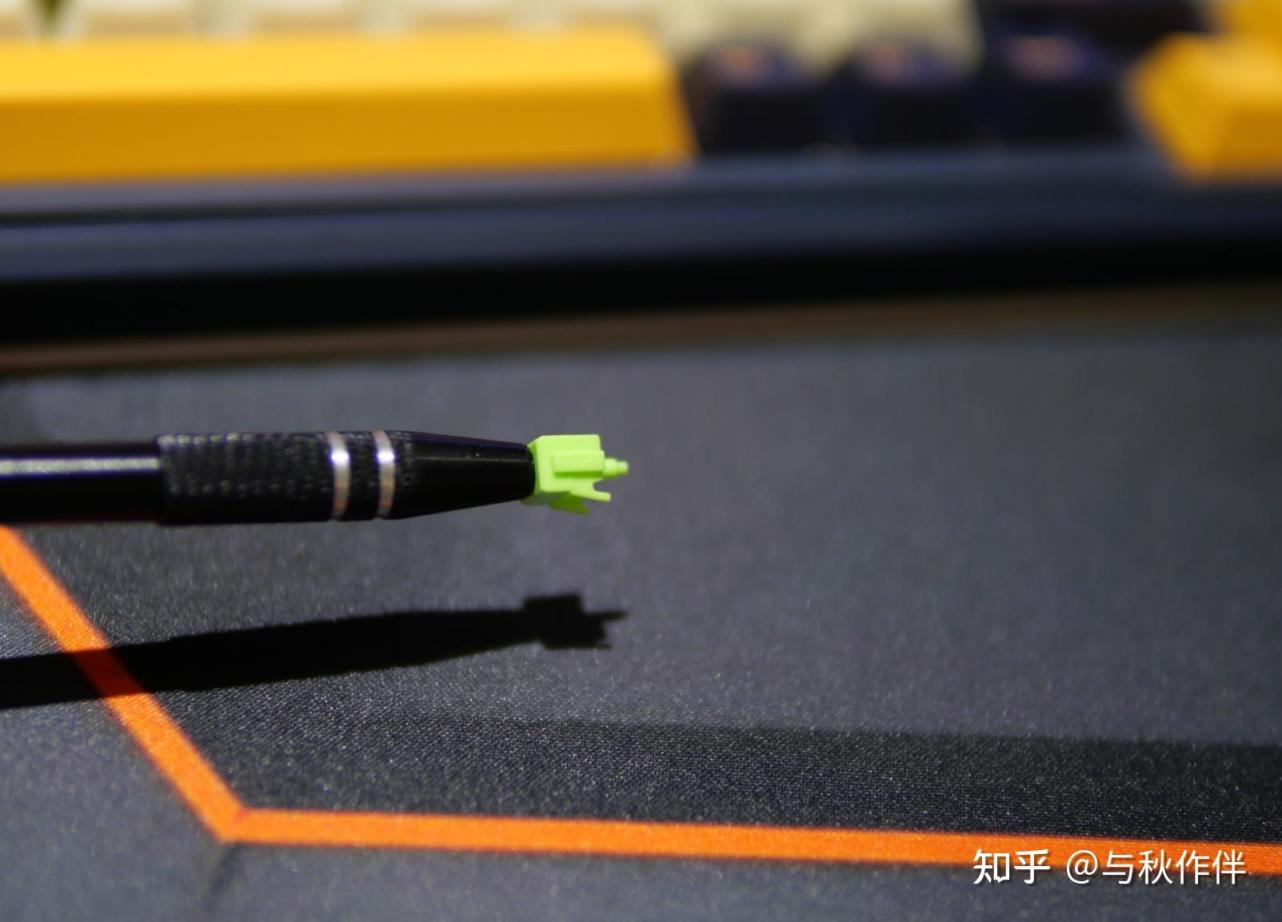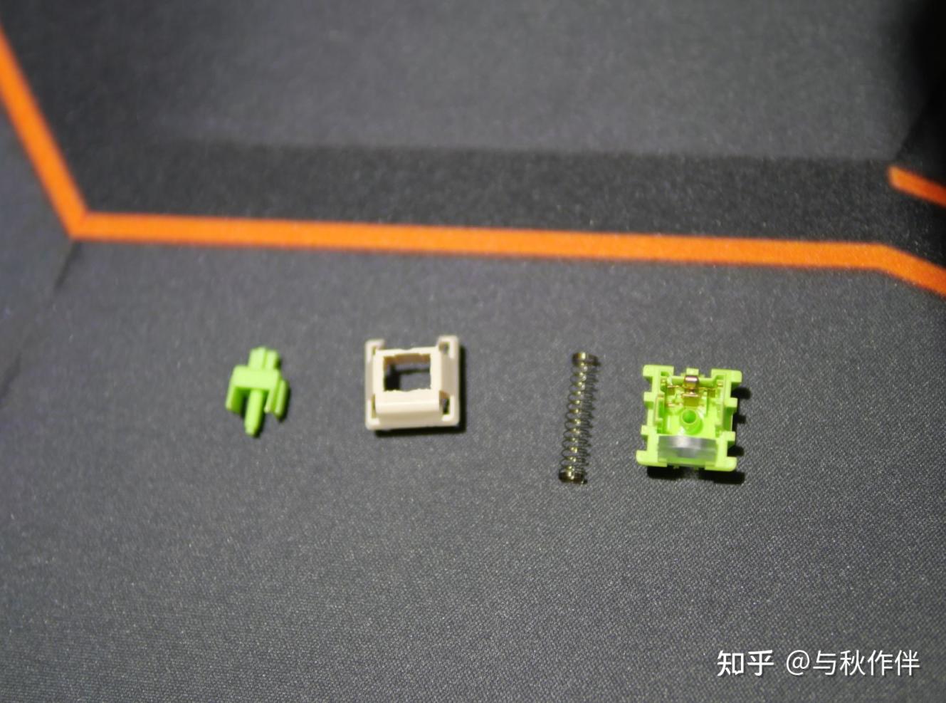 开轴可以看到里面采用加长的轴心,有助于触底声音更加的干净,轴心小脚上和两侧导轨及其侧壁上都有均匀的、薄薄的出厂润滑。绿加乳白的配色看起来也是很漂亮。