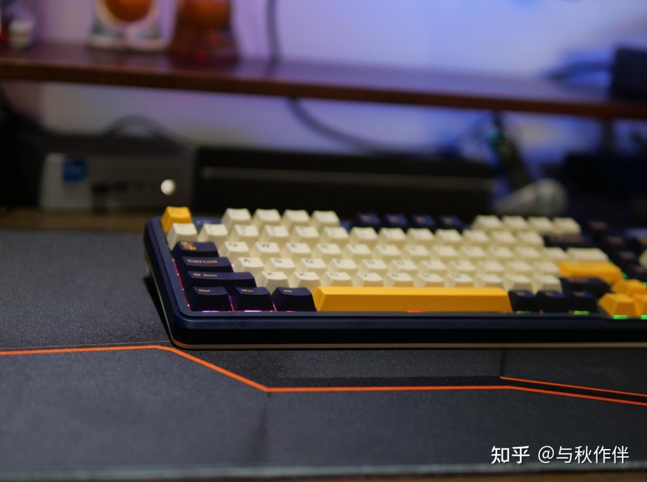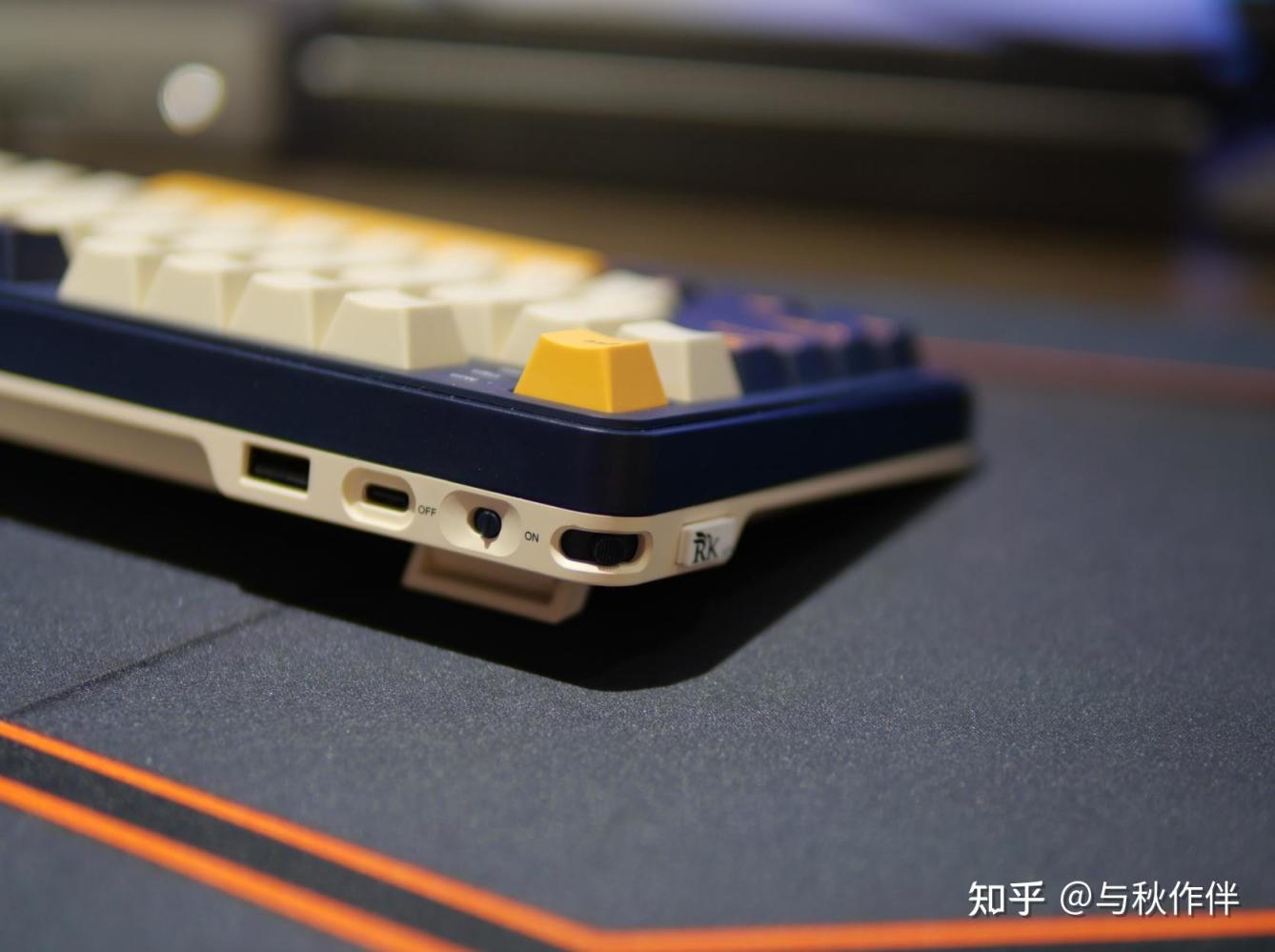 上下盖深蓝+乳黄的双拼色设计记上同样搭配的键帽,看起来非常有质感,尤其是S98上的这个二色键帽素质也十分不错,表面有颗粒感的纹路,摸起来舒服,耐磨度感觉也会不错的选择。