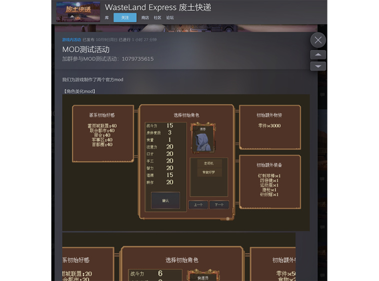 更強的是,官方10月29日發公告,steam創意工坊也實裝了!這意味着未來玩家可以自己執筆廢土故事,定義各種稀奇古怪的角色(喪...喪屍新娘?)。