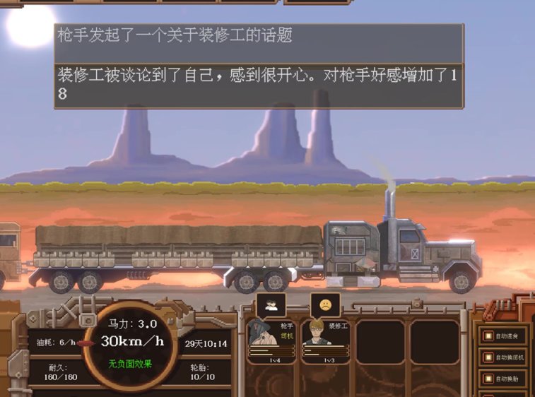 框架與玩法拓展讓這款遊戲擁有更多的可能性。你可以當個倒爺拉貨轉賣,也能去四處探險打喪屍,在有空時去酒館喝兩杯,說不定就遇上合適的同伴或者意中人。甚至,你可以當帶惡人,只要道德夠低,就不會被束縛!