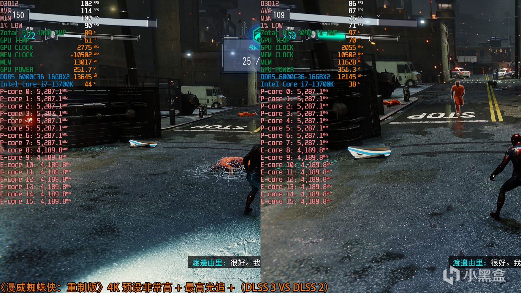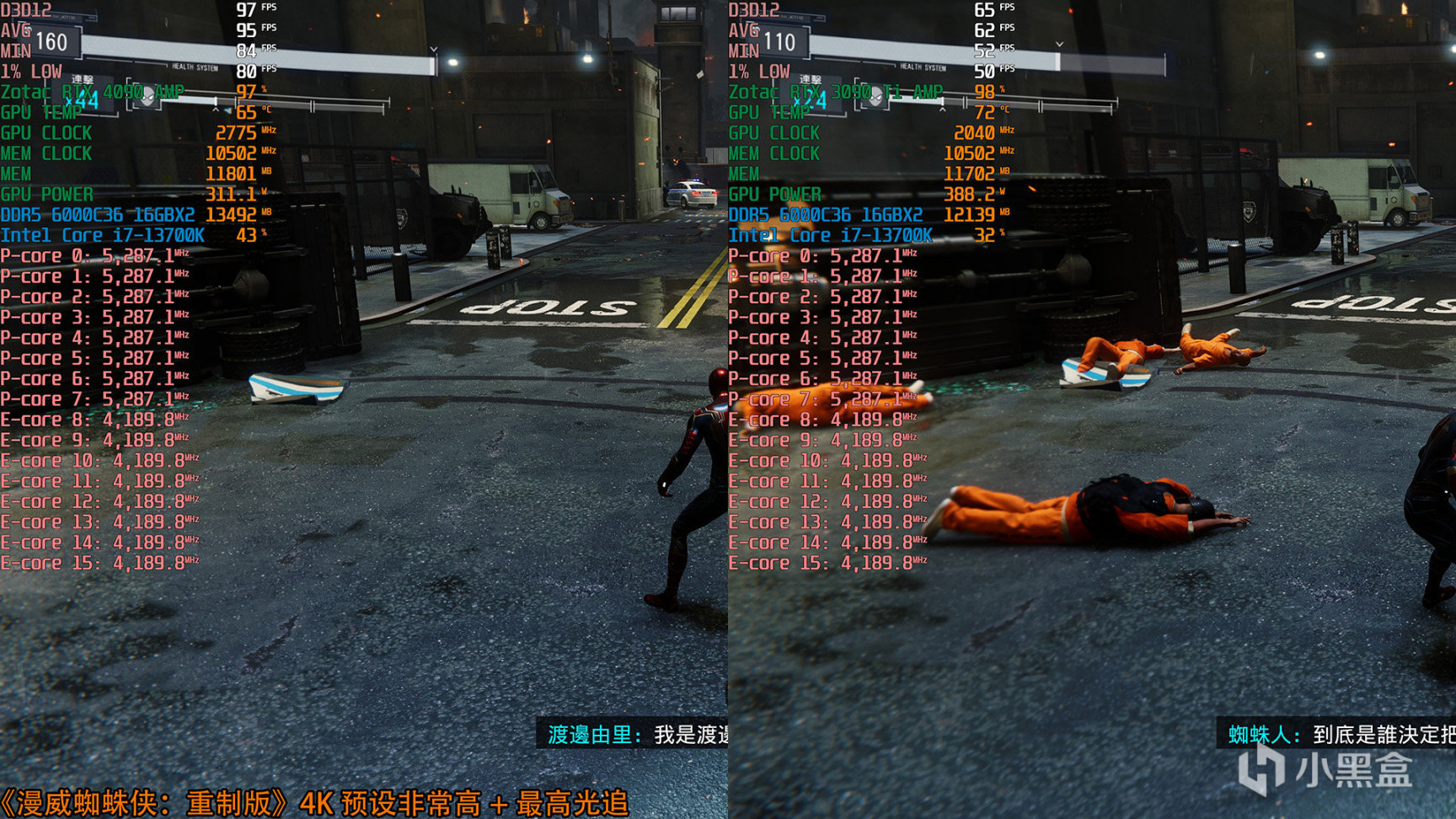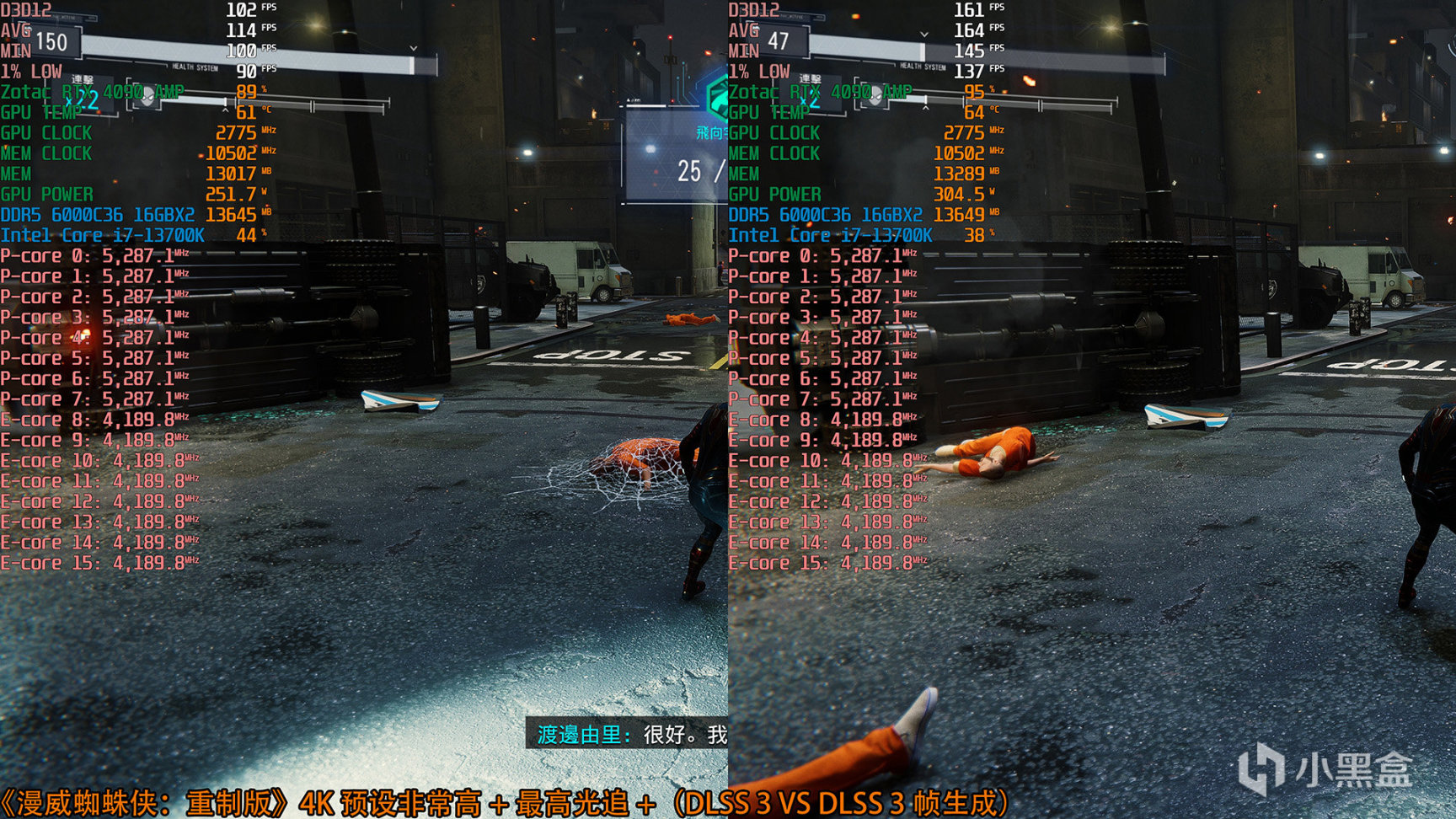《漫威蜘蛛侠:重制版》4K预设非常高+最高光追+DLSS 3,RTX 4090 AMP未补帧平均帧数为114fps,RTX 4090 AMP补帧后平均帧数为164fps,提升达到了44%