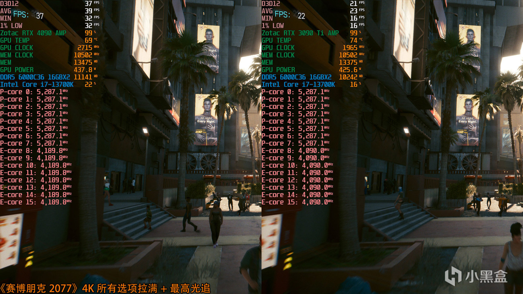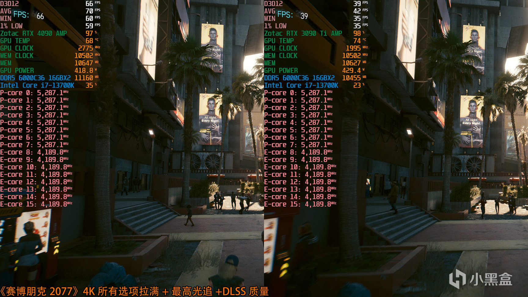《赛博朋克2077》4K所有选项拉满+最高光追,RTX 4090 AMP平均帧数为39fps,RTX 3090 Ti AMP平均帧数为23fps,提升达到了70%