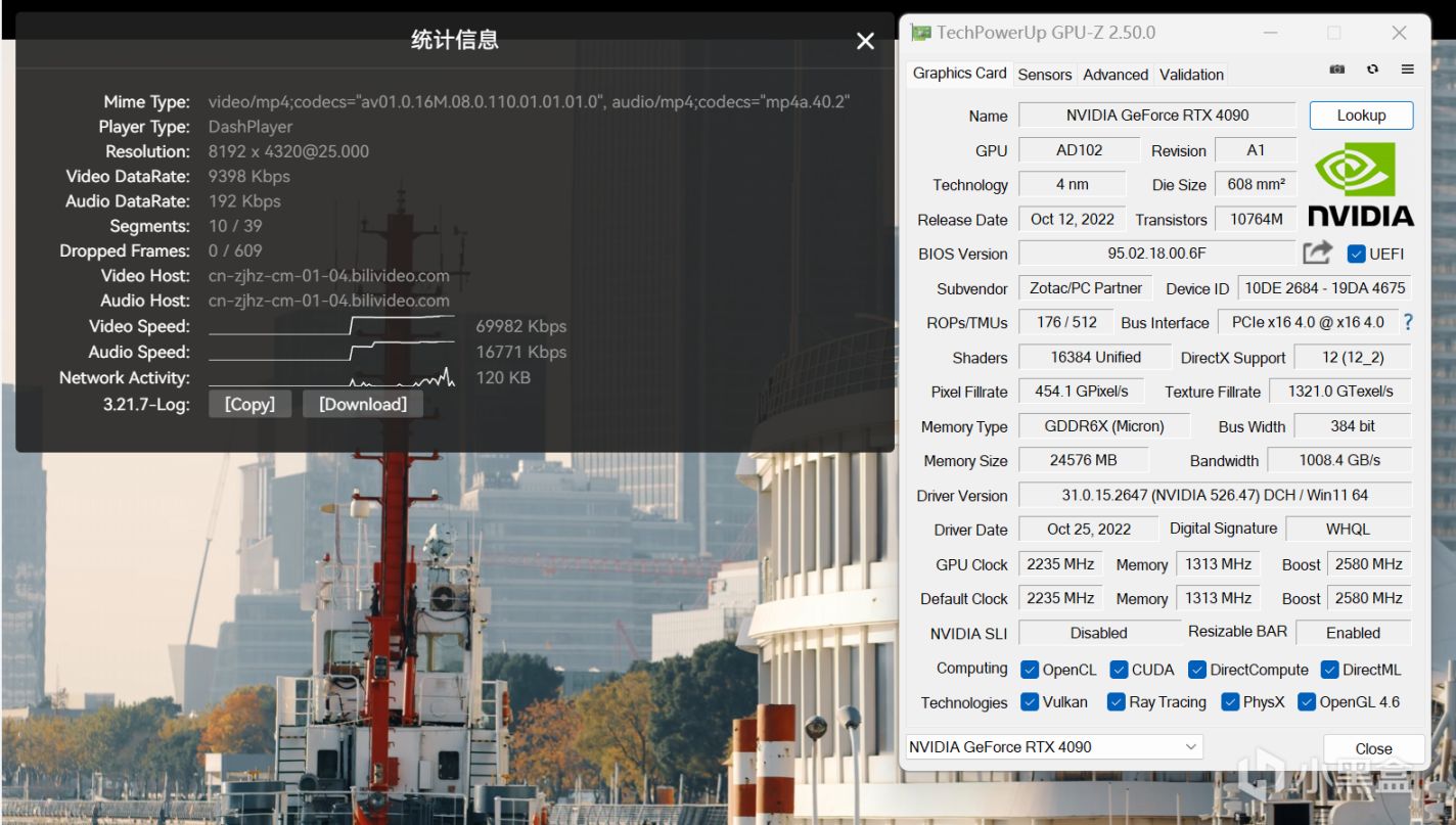 RTX 4090 AMP当然也支持AV1解码,RTX 30系就有此功能,现今支持AV1解码的视频网站,视频分辨率越高,根据显卡支持会优先使用AV1解码