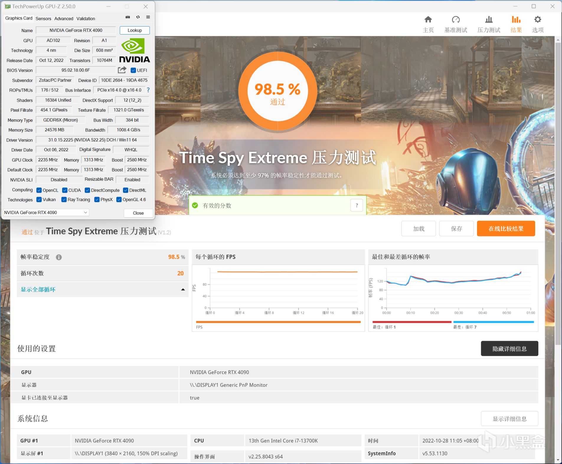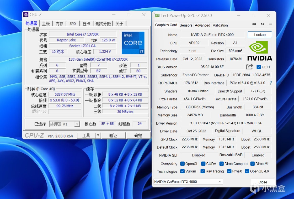 搭载Windows 11 22H2最新操作系统(针对十三代酷睿大小核调度更好),使用NVIDIA驱动526.47 WHQL最新显卡驱动版本,Core i7-13700K设置处于默认状态(个人也建议RTX 4090至少搭配i7-13700K),近打开X.M.P配置达成DDR5 6000C36 16GBX2双通道状态。