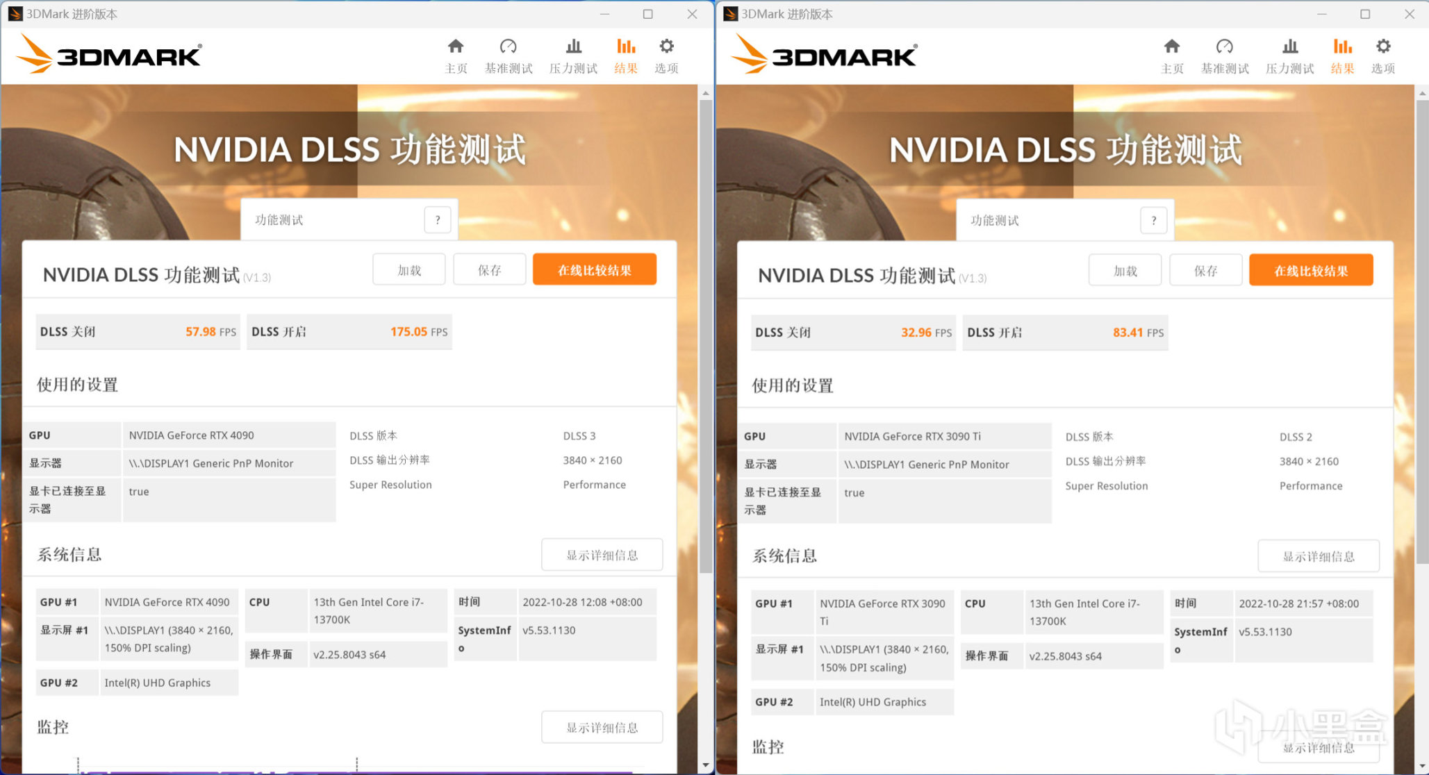 3DMark理论项目一共测试了8个,其中在传统FS和TS项目中,RTX 4090 AMP在最小的1080P分辨率也能达到50%以上的性能提升,2K分辨率则是浮动在60%到70%左右,4K分辨率达到最大80%提升。对于光追项目也有70%左右的提升,光看以上项目就能得出一个结论,你可以把RTX 3090 Ti看作是流畅4K游戏显卡,而RTX 4090则是高帧4K游戏显卡。而DLSS 3的性能增幅来自于补帧技术,本质上还是使用DLSS 2,不过这需要RTX 40系的硬件支持,再搭配NVIDIA Reflex技术,且算是完美版的DLSS 2。