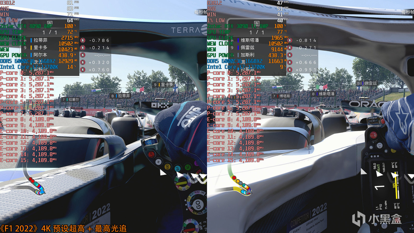 《F1 2022》4K预设超高+最高光追,RTX 4090 AMP平均帧数为83fps,RTX 3090 Ti AMP平均帧数为51fps,提升达到了63%