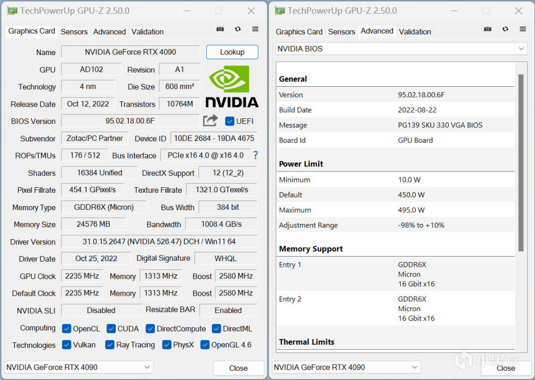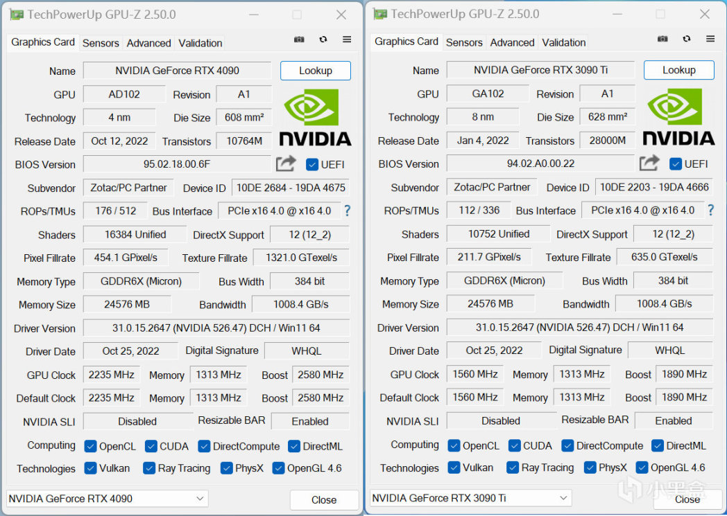 GPU-Z规格图对比,RTX 4090 AMP和RTX 3090 Ti AMP都属于典型的超公版设计,其中RTX 4090 AMP Boost频率达到了2580Mhz,而RTX 3090 Ti AMP是1890Mhz,光看核心频率都差距很大,两者都会开启开启Resizable BAR技术为显卡提升一些性能。