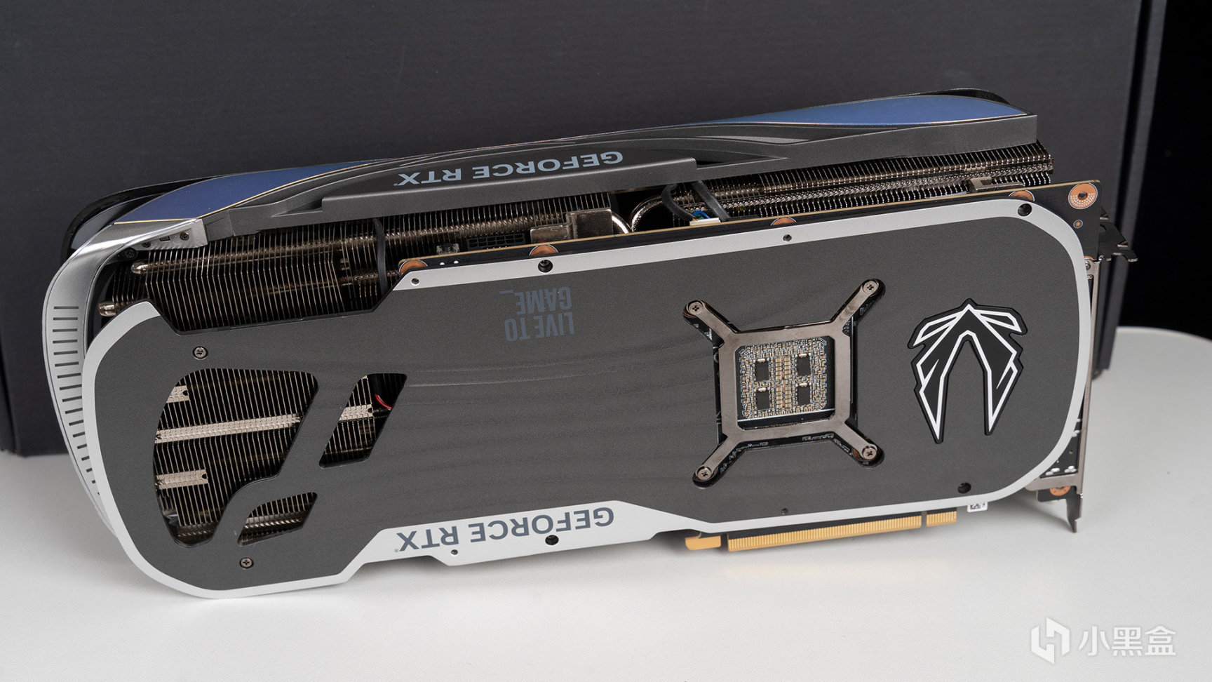 背面是厚实的金属背板加装,风格和正面导流罩有着相似的圆润化设计,都是有一些简洁而柔美的线条装饰,背板上的AMP LOGO是支持ARGB灯效的,此外,在GPU核心背板区域设有一个金属固定支架,显然保护性更好。