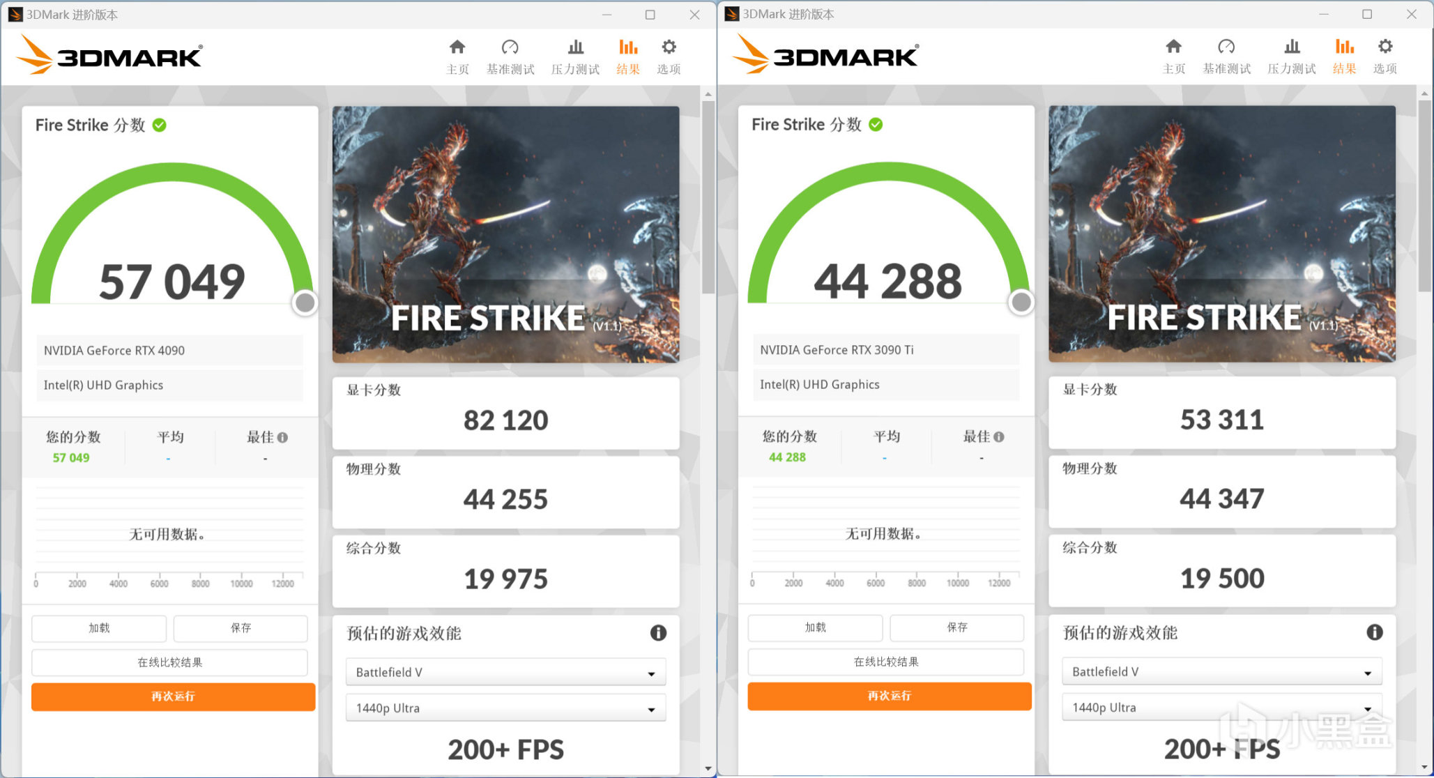 3DMark Fire Strike项目,RTX 4090 AMP显卡分数为82120,RTX 3090 Ti AMP显卡分数为53311,提升54%
