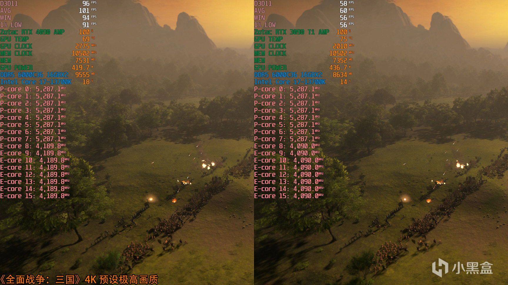 《全面战争:三国》4K预设极高画质,RTX 4090 AMP平均帧数为101fps,RTX 3090 Ti AMP平均帧数为60fps,提升达到了68%