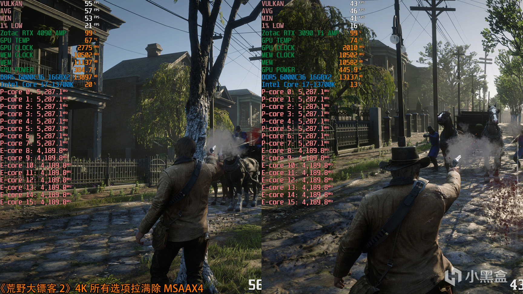 《荒野大镖客2》4K所有选项拉满+MSAAX4,RTX 4090 AMP平均帧数为57fps,RTX 3090 Ti AMP平均帧数为46fps,提升达到了24%