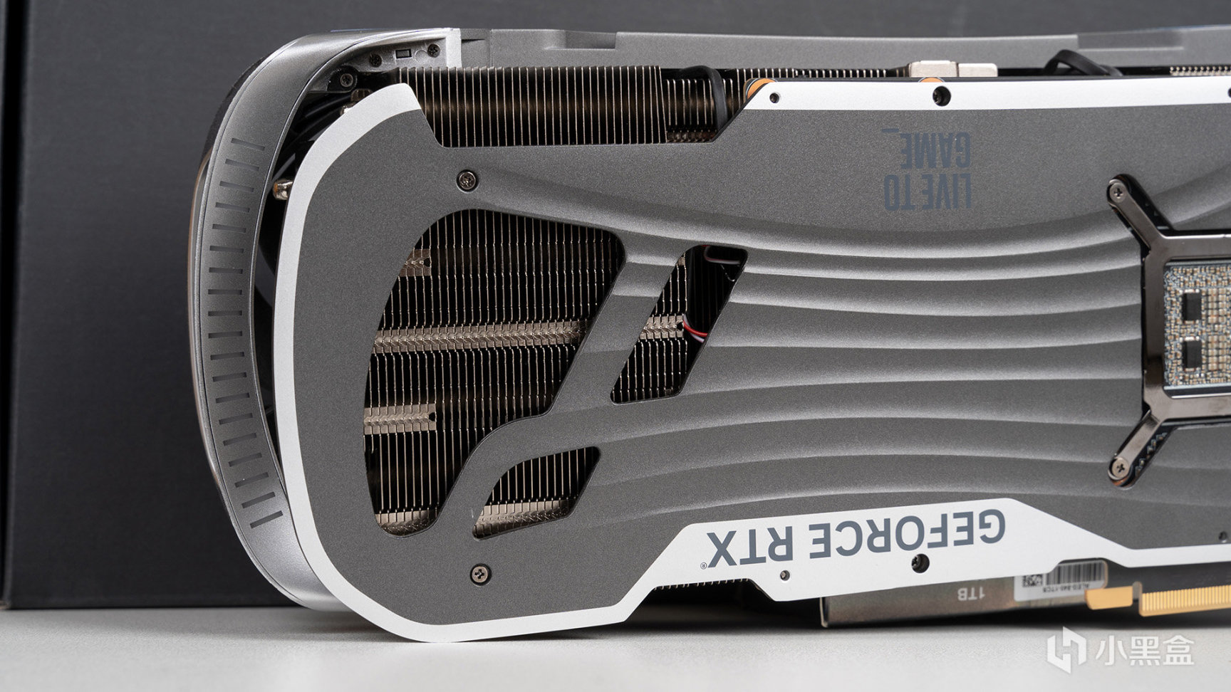 背板尾部有大面积镂空处理,这种属于目前显卡的主流设计思路了,而导流罩延伸处也有一些线状排列的ARGB灯效设计。