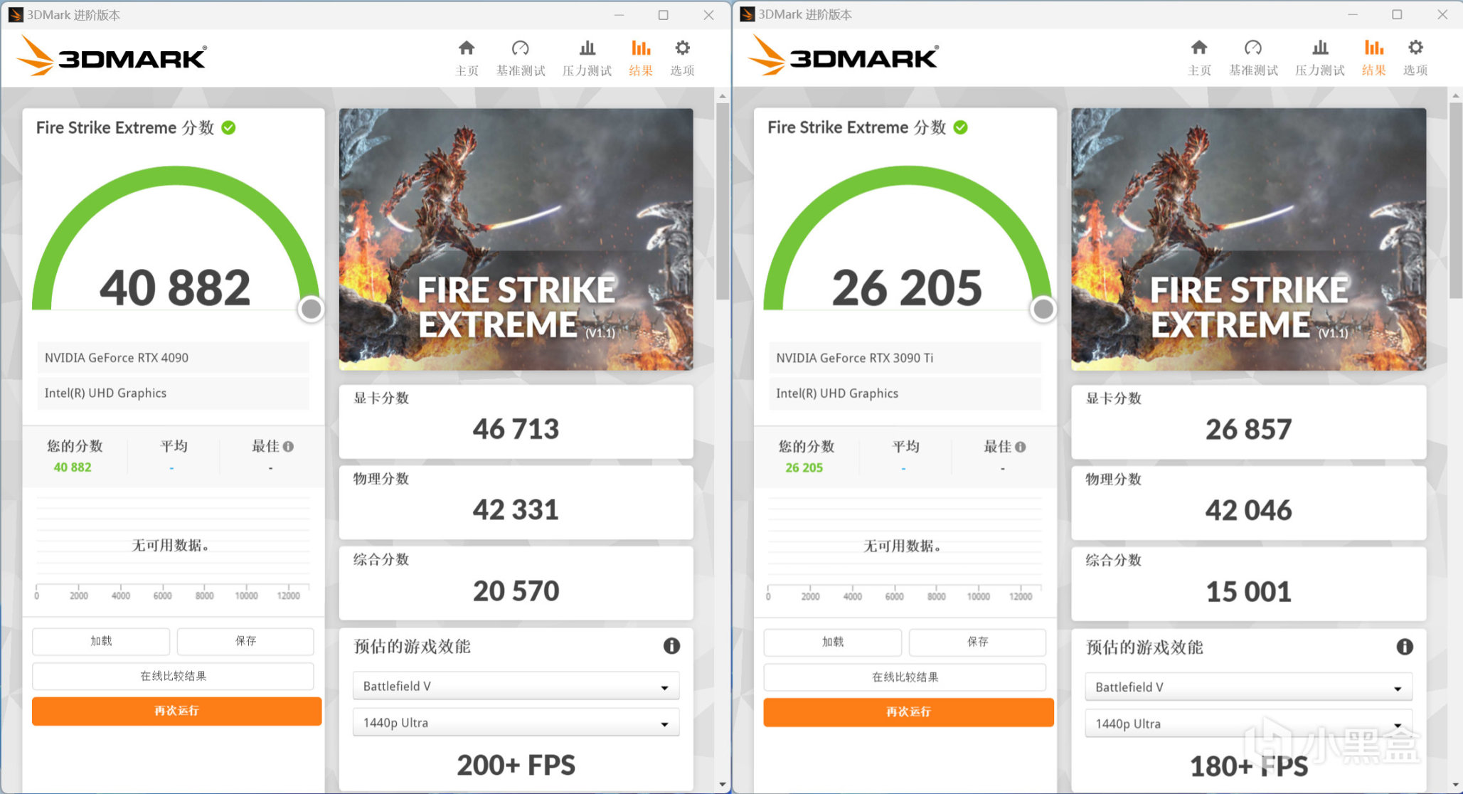 3DMark Fire Strike Extreme项目,RTX 4090 AMP显卡分数为46713,RTX 3090 Ti AMP显卡分数为26857,提升74%