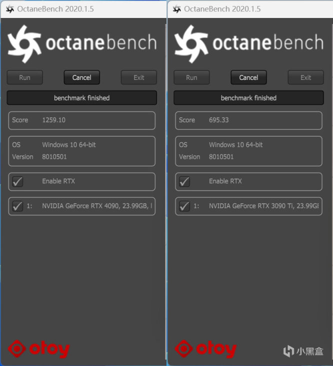 RTX 4090 AMP在Octanebench RTX渲染项目得分为1259,RTX 3090 Ti AMP在Octanebench RTX渲染项目得分为695,提升达到81%