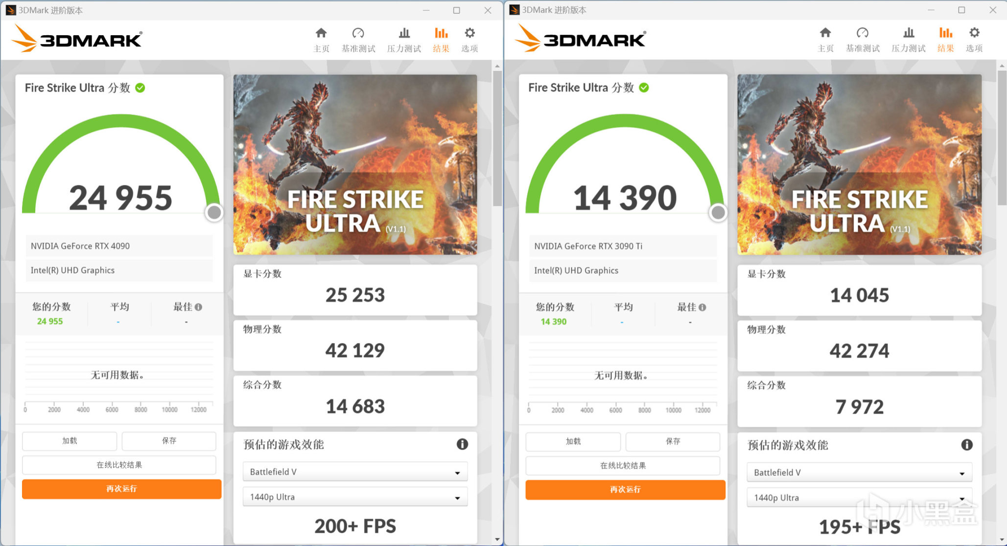 3DMark Fire Strike Ultra项目,RTX 4090 AMP显卡分数为25253,RTX 3090 Ti AMP显卡分数为14045,提升80%
