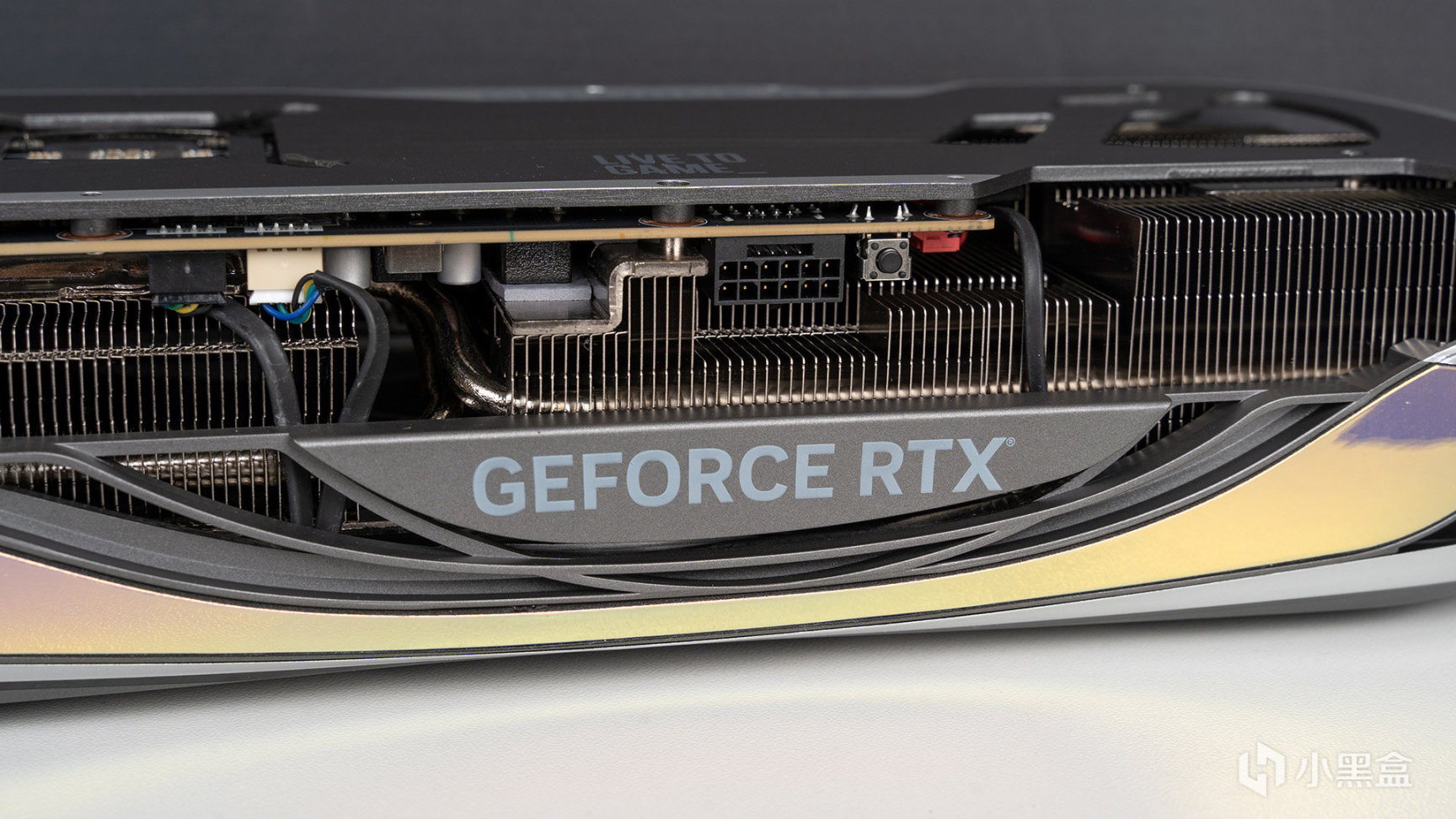 显卡采用最新的12VHPWR供电接口,这一代接口布局设计更合理一些,底下没有遮挡物插拔更流畅,旁边黑色的按钮可以实现切换BIOS功能,可切换静音和加速两种模式。