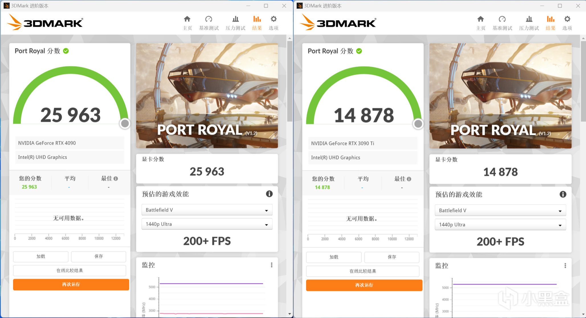 3DMark Port Royal光追项目,RTX 4090 AMP显卡分数为25963,RTX 3090 Ti AMP显卡分数为14878,提升74.5%