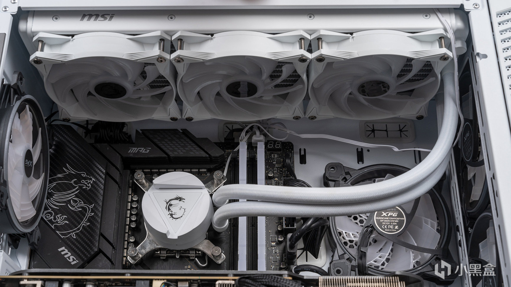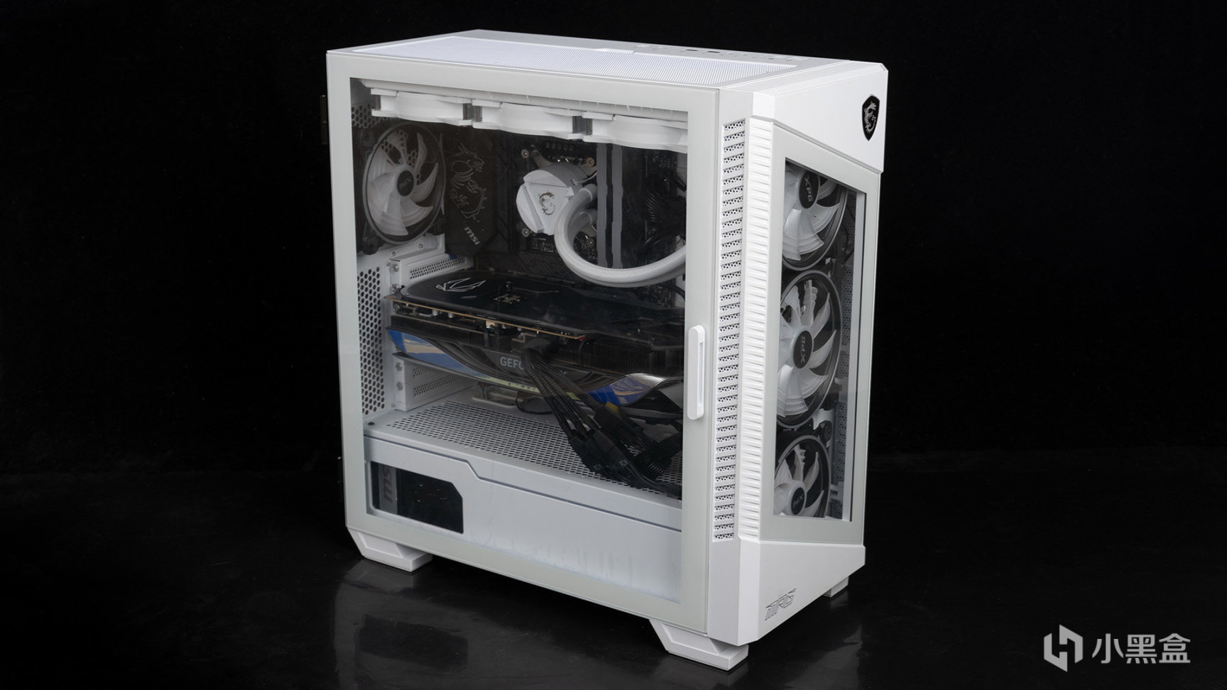 介绍下配套的测试硬件,机箱使用的是微星MPG VELOX 刀锋100R白色款,属于典型的钢化玻璃侧透设计,前部和机箱侧面分别安装三枚和一枚ARGB风扇,用于整机进风,顶部是360水冷CPU散热器,后部则是一枚120mm ARGB风扇,用于整机排出热量,这款机箱还内置六路ARGB控制器,具备USB 3.2 Gen 2 Type-C接口,产品定位属于功能全面化。