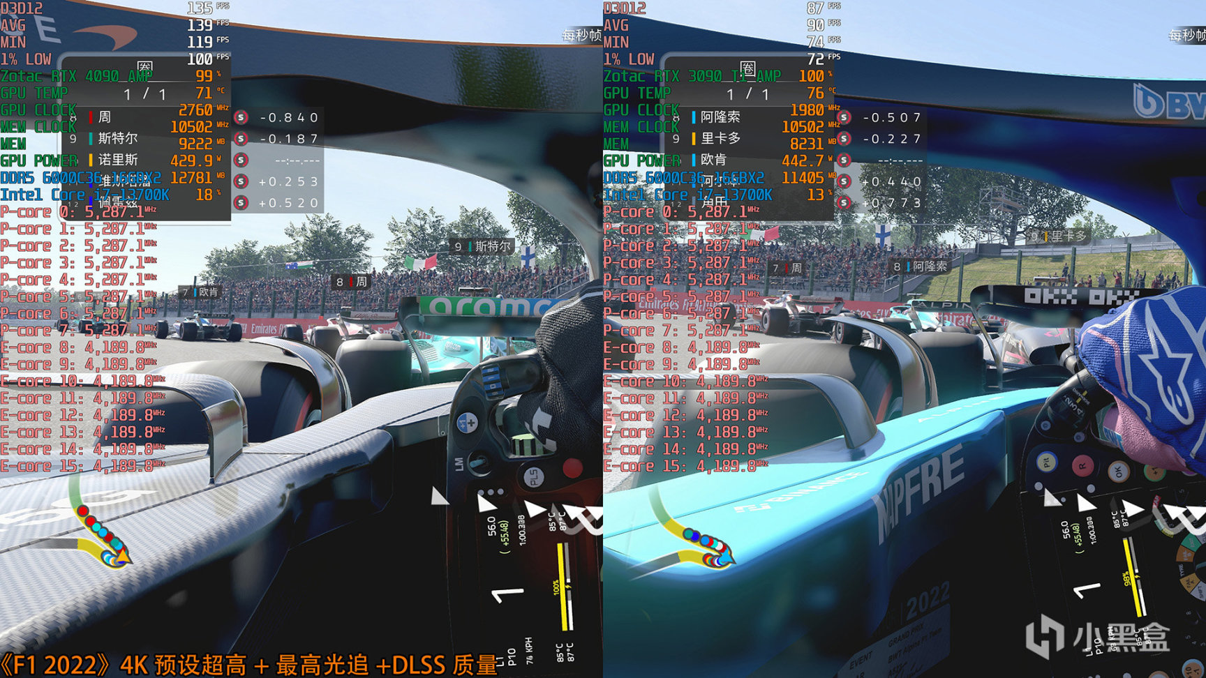 《F1 2022》4K预设超高+最高光追+DLSS 2质量,RTX 4090 AMP平均帧数为139fps,RTX 3090 Ti AMP平均帧数为90fps,提升达到了54%