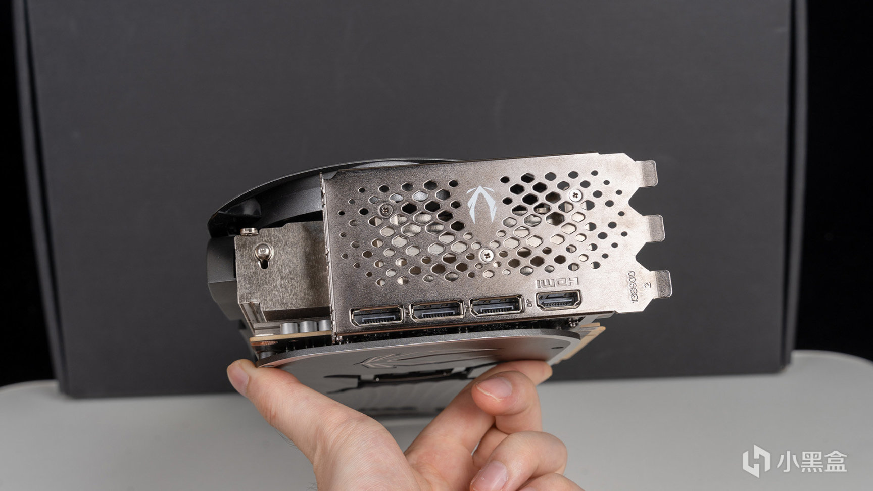 RTX 4090 AMP在视频输出方面和上一代没什么变化,都是3*DP1.4a和1*HDMI 2.1的组合,8K60HZ超高清和多屏很轻松,这个角度观察也能发现显卡相当厚,达到了3.5槽和2KG重量,个人建议使用显卡支架。
