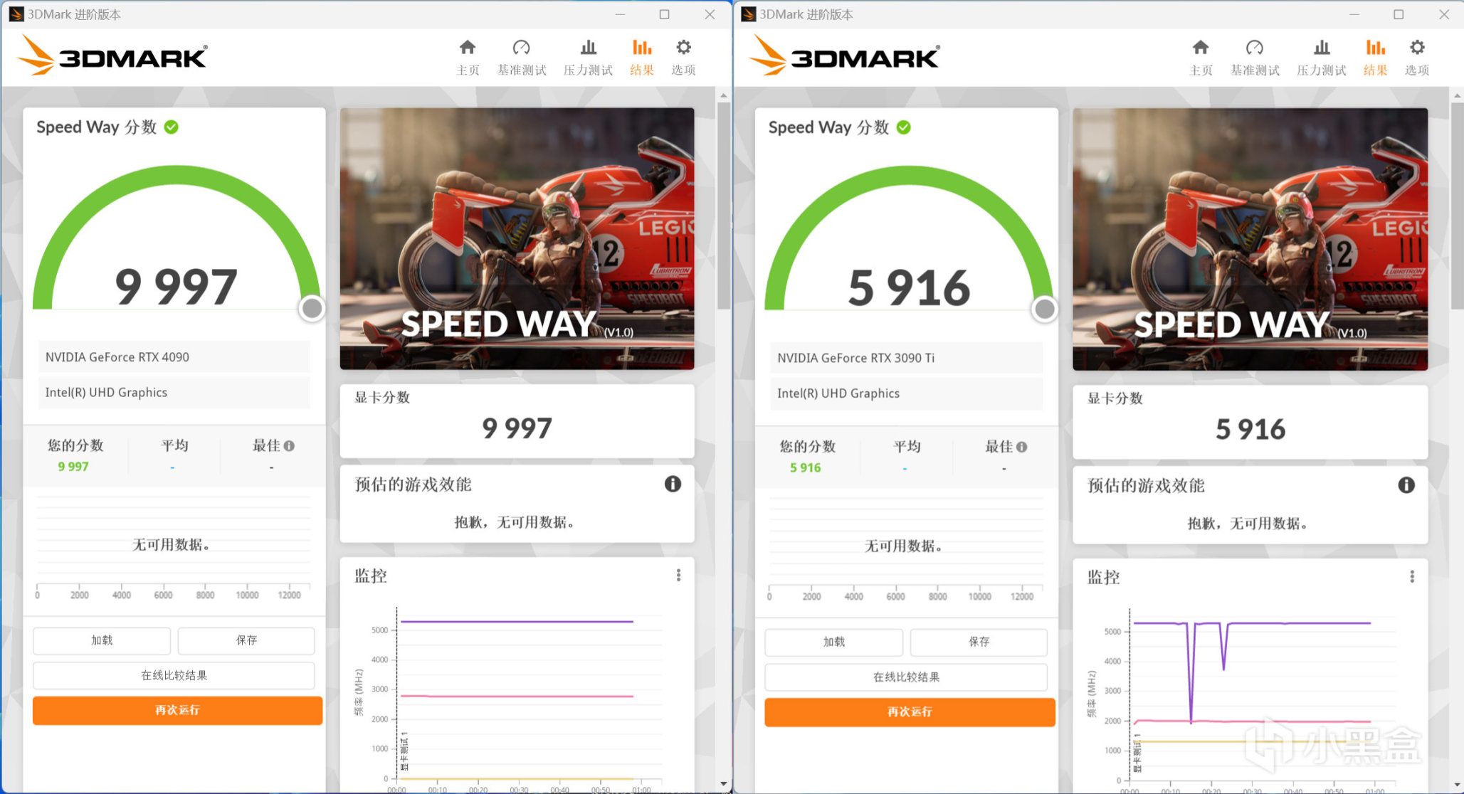 3DMark SPEED WAY光追结合光栅化项目,RTX 4090 AMP显卡分数为9997,RTX 3090 Ti AMP显卡分数为5916,提升69%