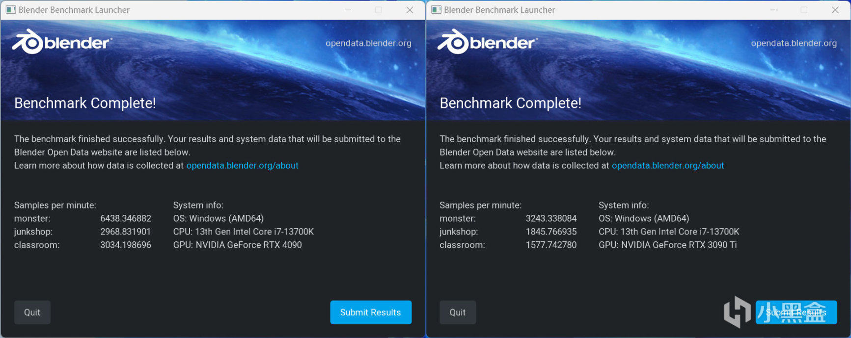 RTX 4090 AMP在Blender中的Monster、Junkshop和Classroom三项采样成绩分别是6438、2968和3034